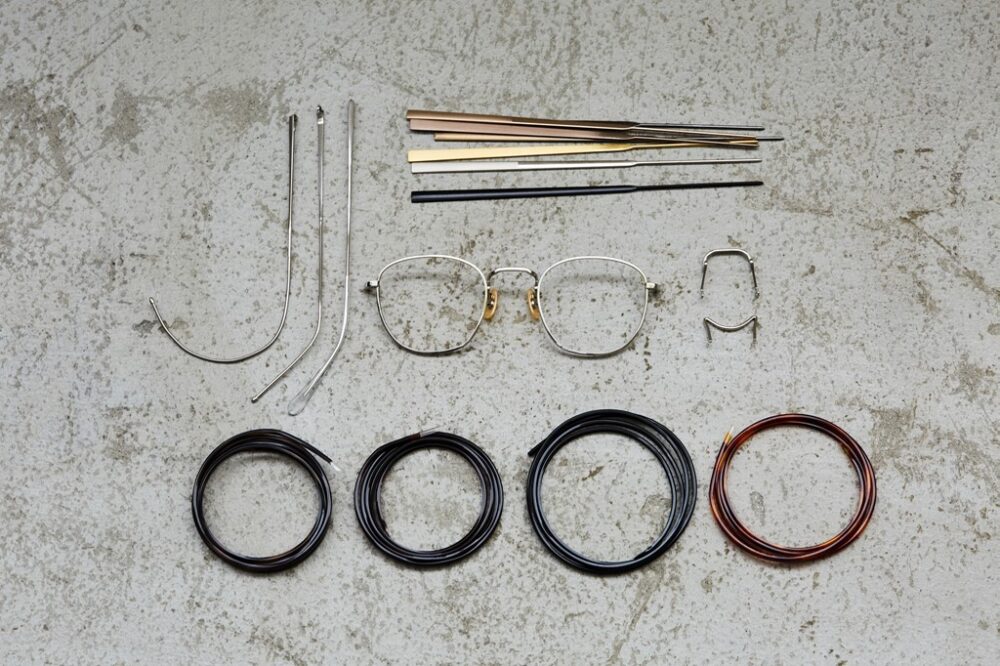 鯖江で1941年に創業した老舗工場、水島眼鏡の技術力によってフレームパーツのカスタマイズやオリジナルカラーでの塗装が繰り返し可能。ブリッジ(マンレイ、一山)やテンプル(セルモダン、縄手)などパーツを組み替えるカスタマイズはもちろん、貴金属メッキや七宝加工といった表面処理、職人による手彫り彫金なども受け付ける。