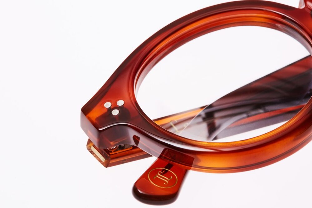 ボリュームのあるアセテートを生かした、丸みを帯びたラウンドシェイプ。太いテンプルをしっかりと固定するため、フロントから三点鋲で留められているのもフレンチスタイルだ。
