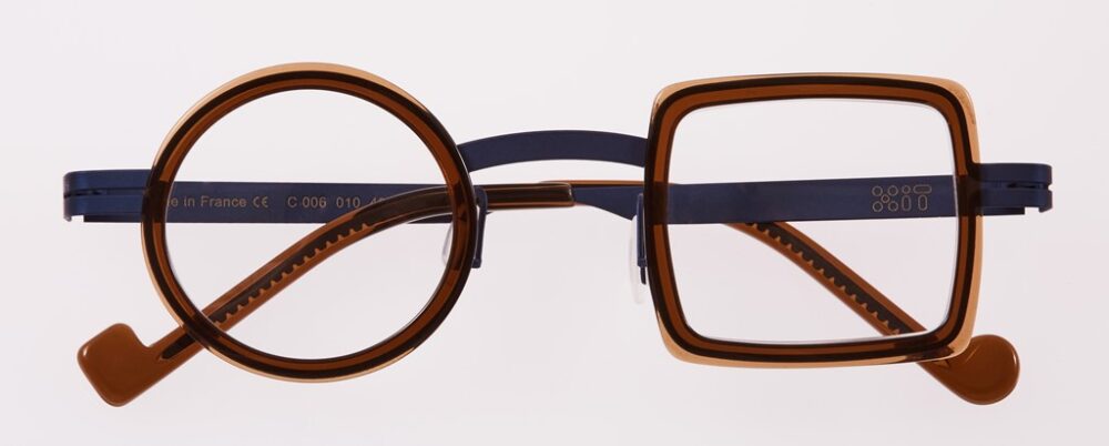 メタルブロウにアセテートリムがぶら下がったスタイル。同じコンビブロウでもアメリカでは重厚なサーモントになり、フランスでは繊細なアモールとなる。