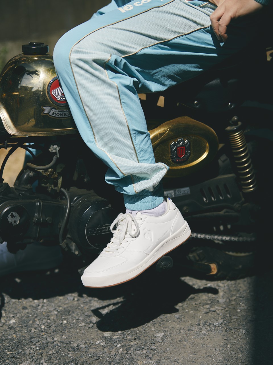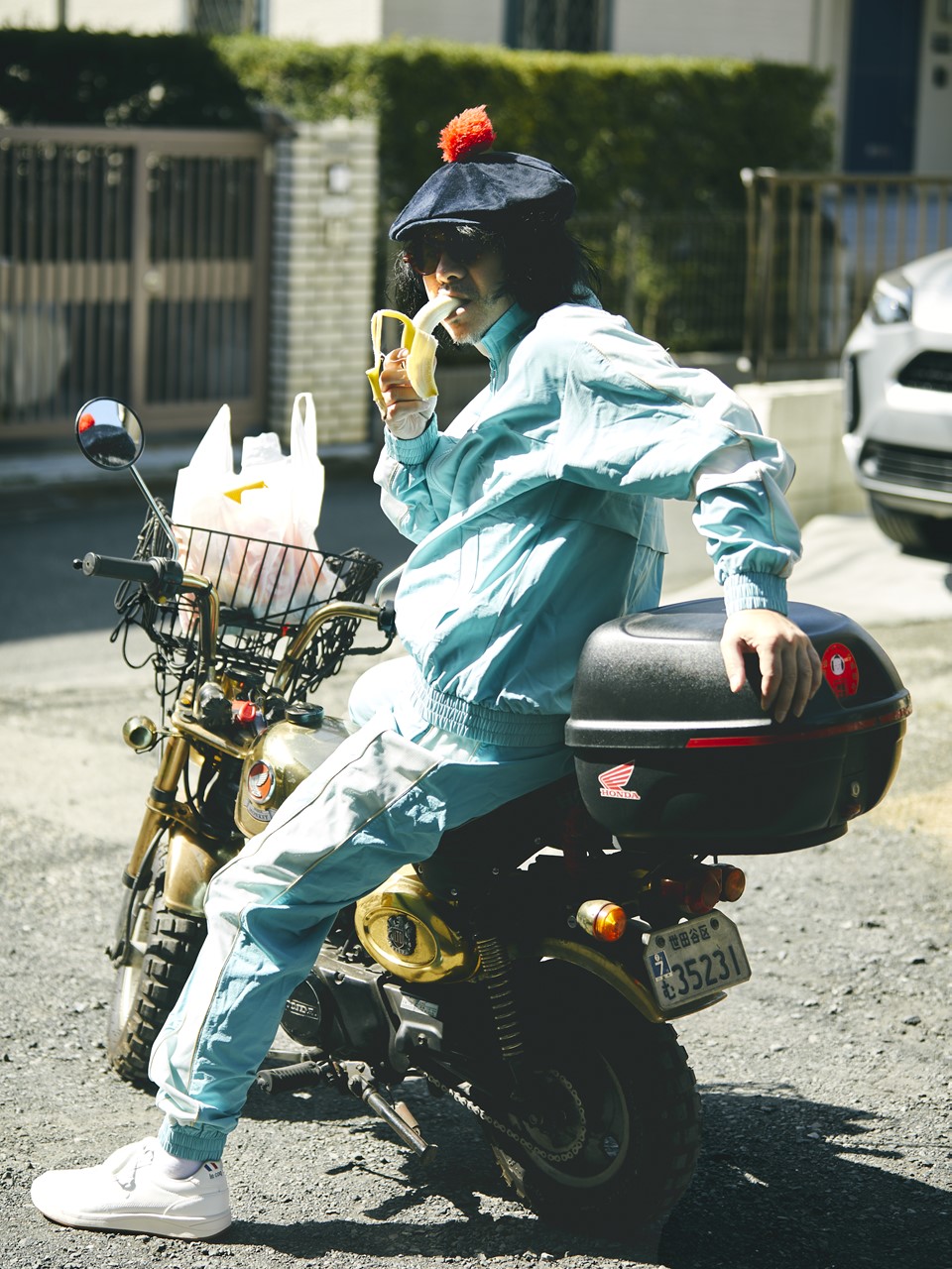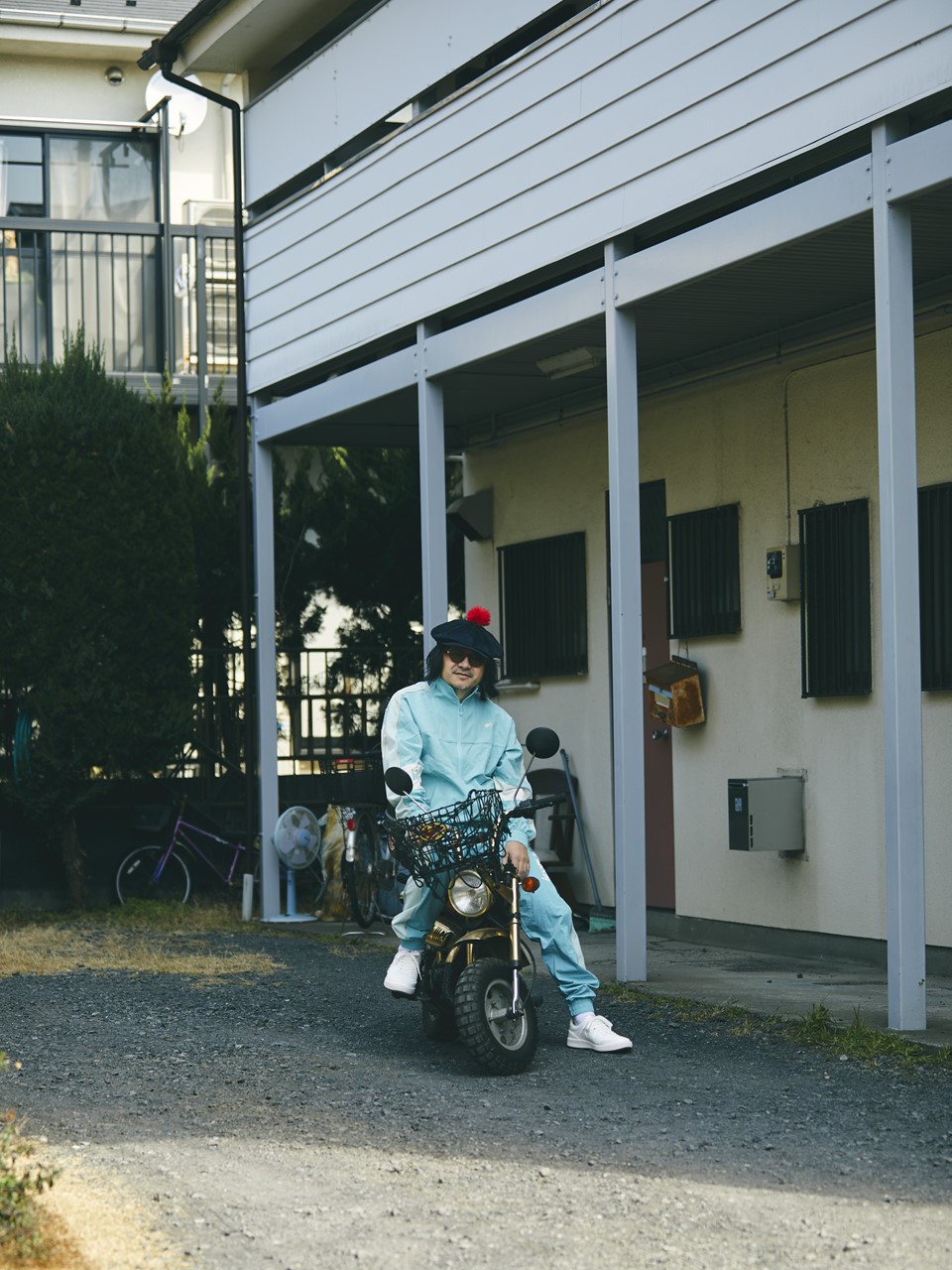 かせきさんの“足” として活躍する金ピカ仕様の愛車、ホンダのモンキーとパステルブルーのセットアップが最高にお似合い。排気量50ccだから、自転車に抜かれてしまうこともあるけど、「お先にどうぞ」のスタンスでいつでも余裕シャクシャクが、かせきさんスタイル。
