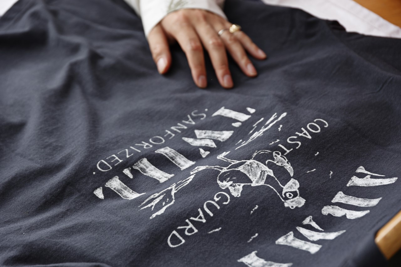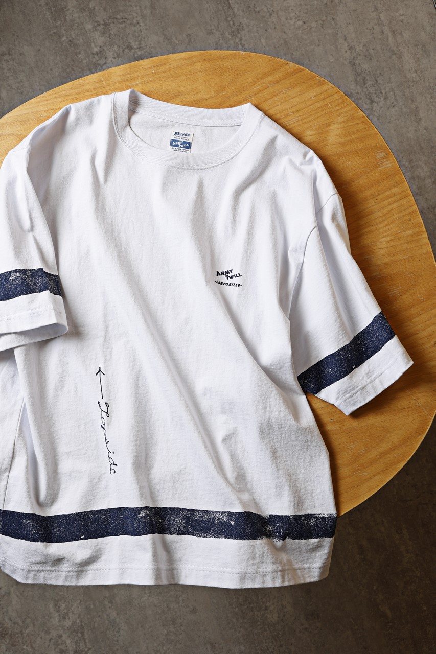 U.S.ネイビーのブランケットをデザインソースにしたプリントTシャツもレリューム限定。「プリントのかすれ具合でブランケット感を表現しました」(多田)。5940円