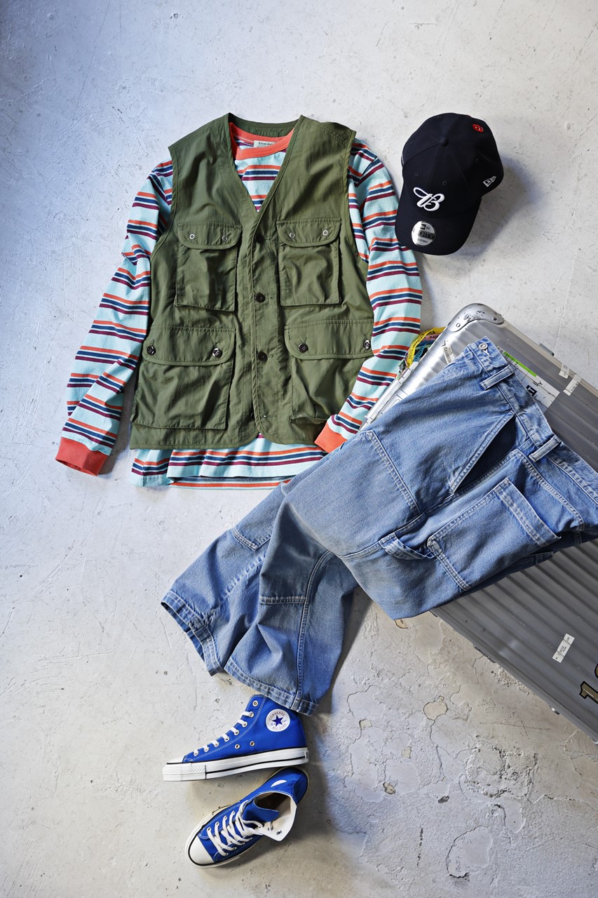 ベスト以外のアイテムすべてに青系の色を取り入れたストリートスタイル。レトロボーダーでさらに色を足しつつ、オリーブが全体を引き締めている。「スポーティさが増して、シーンも性別も問わず着られる一着になりましたね」(多田)
