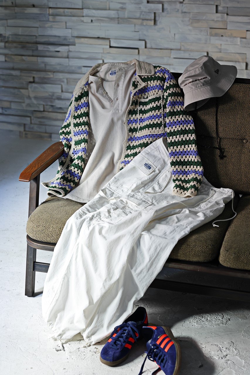 トレンド感のあるざっくりと編まれたニットを主役とした着こなし。「ベージュをトーンアップするなどブランドとしても今季は“明るい色”に注目していた折、白いカーゴパンツを作りたいというオーダー。さすが山口さん!」(多田)