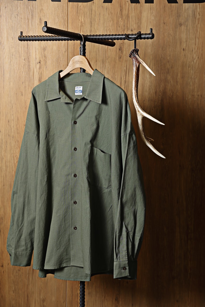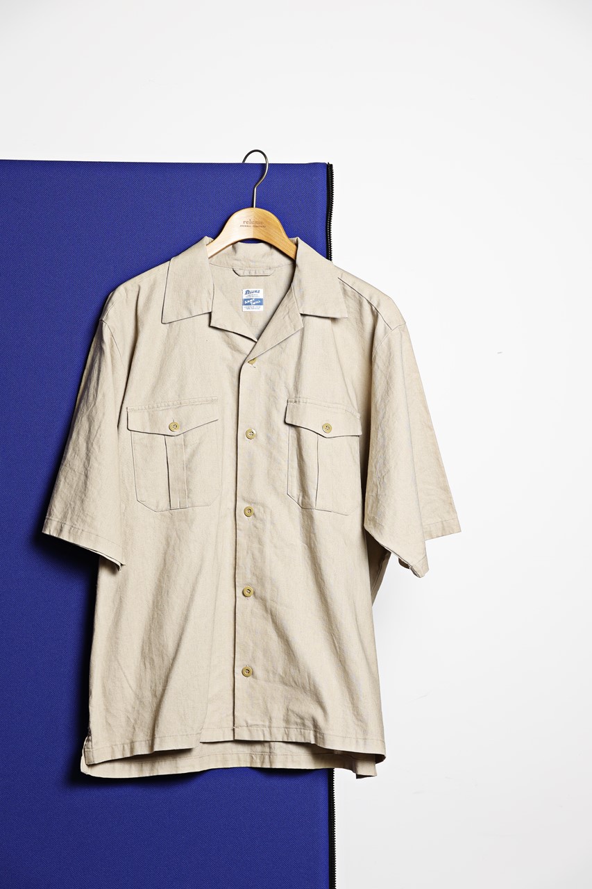 定番人気の開襟シャツは色別注でサファリシャツスタイルに。「この色にすること開襟とのミスマッチ感が引き立ち、ヌケ感のある仕上がりになりました」(多田)。1万4300円