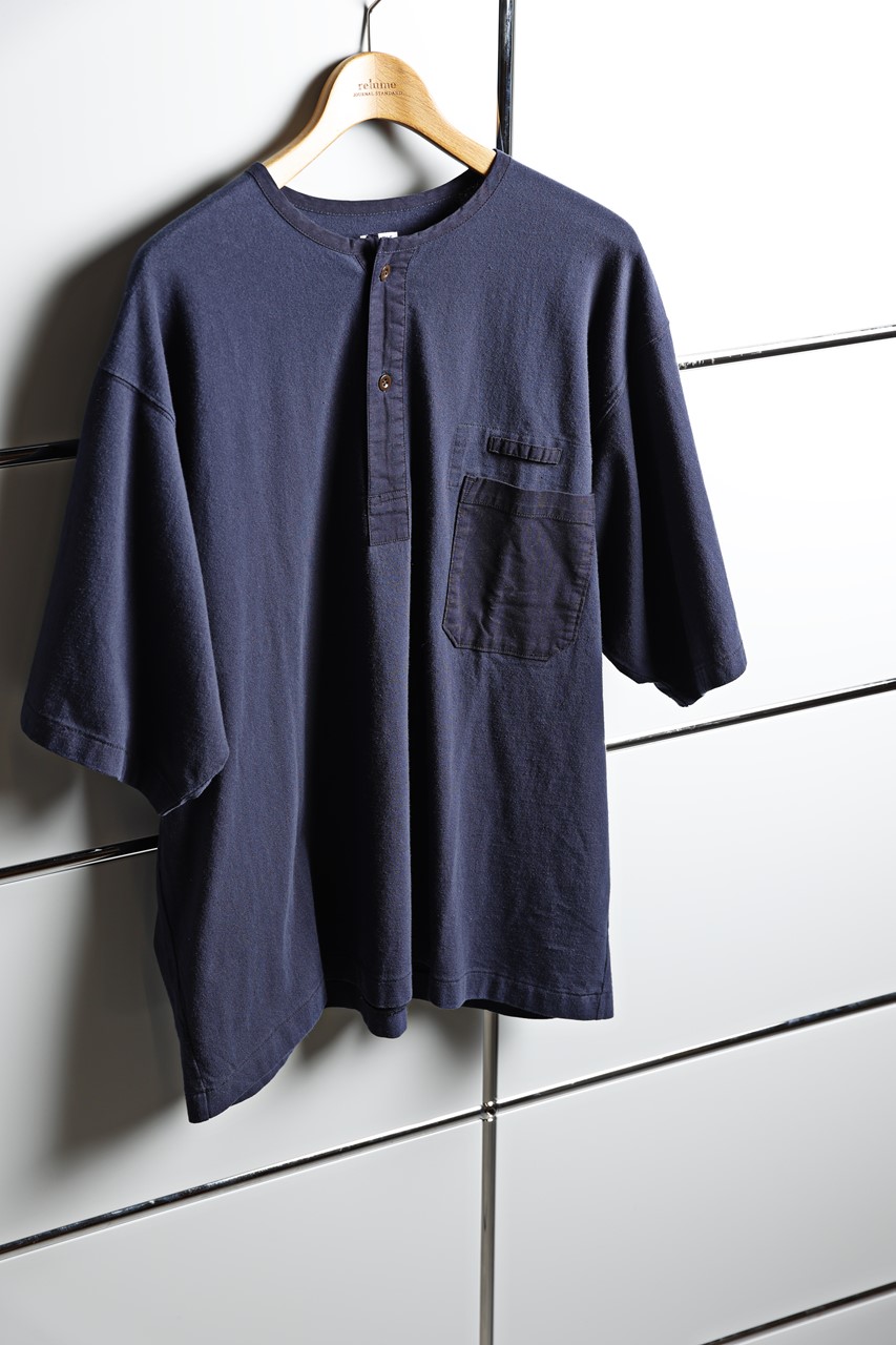 やや厚手のニット素材と布帛の切り返しが人気のヘンリーネックTは濃紺カラーで色別注。「ちなみに、上のおすすめ2に映っている長袖タイプはJSRだけの展開です」(山口)。8690円