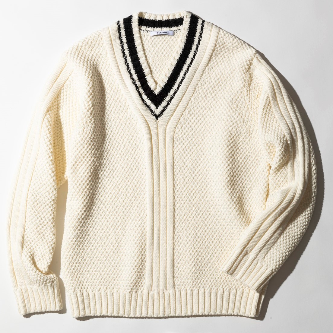 フロントのラインがアクセントになった、モダンな顔のVネックチルデン。国内のニットファクトリーにニュアンスを伝え、膨らみ感のあるケーブル編みと、ギャップのあるドライな鹿の子ボディを同居させている。2万9700円(スローン TEL03-6421-2603)