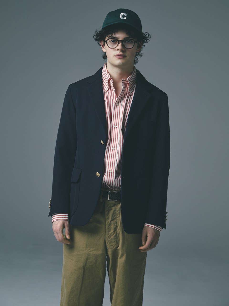 アメリカントラッドのど真ん中、3ボタンのネイビーブレザーを日本製で。国内ウールの名産地尾州で製織したウールサージは、双糸使いが生む自然なツヤがオーセンティックさを引き立てている。7万 400円(オムニゴッド事業部 TEL03-5474-7579)