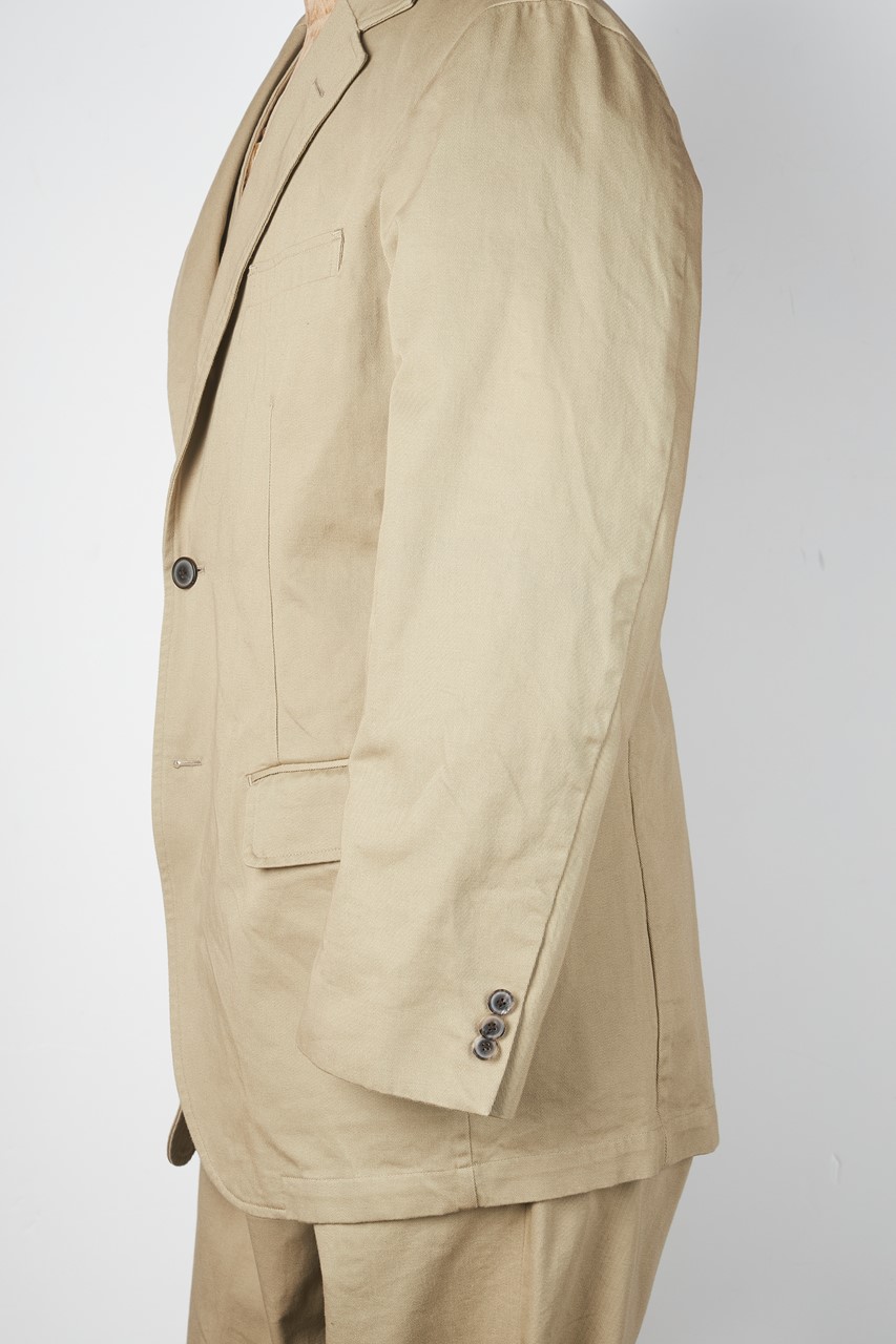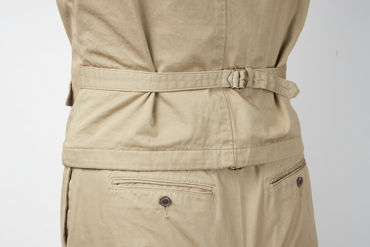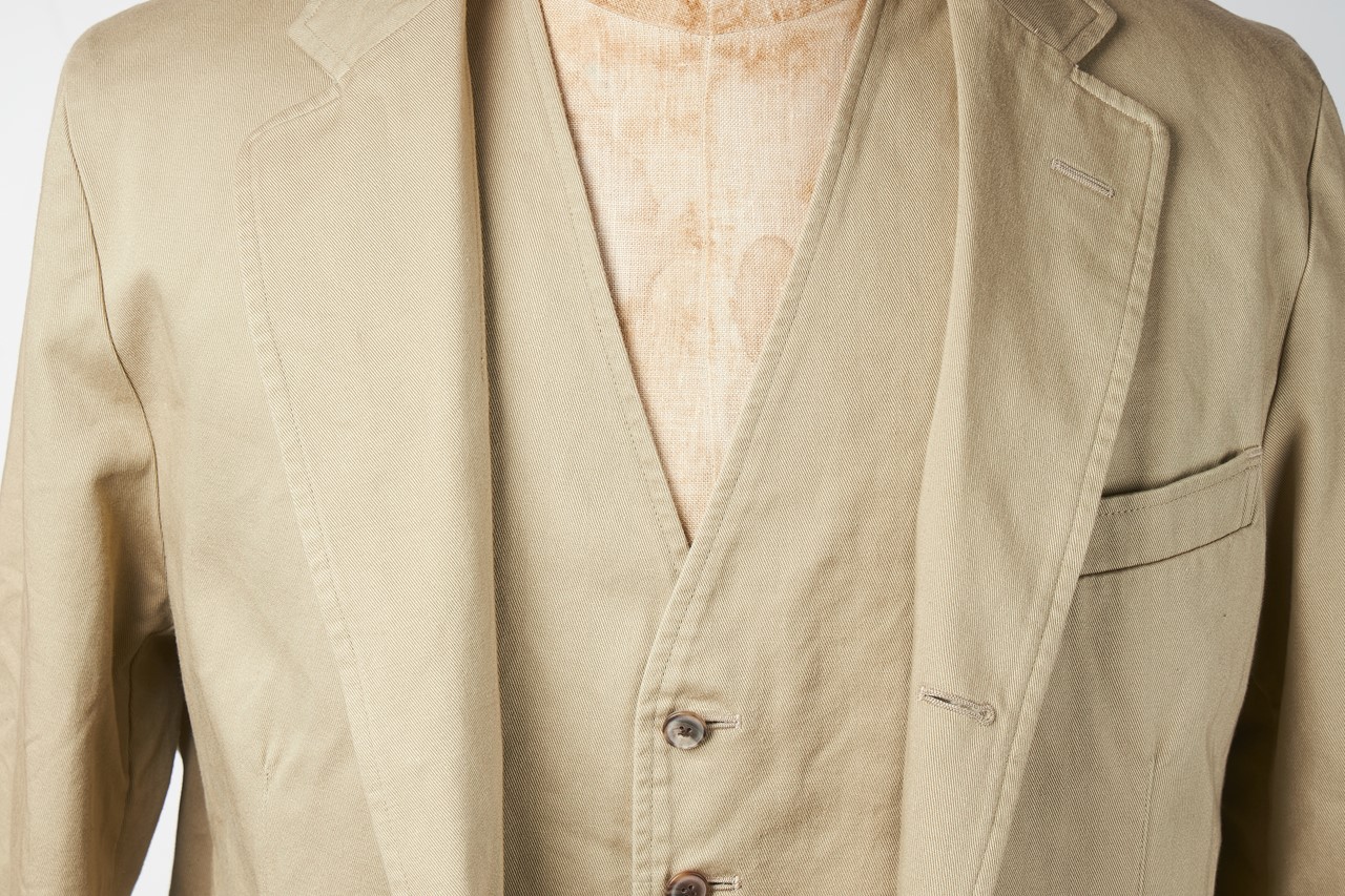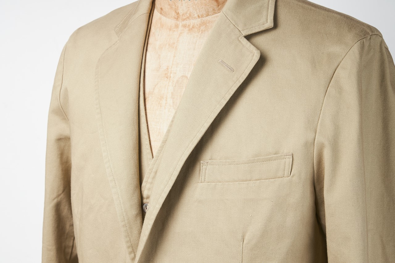 カーキとは、もともとヒンドゥー語で土色を意味する言葉です。本物のチノクロスに見られたオリジナルカーキカラーを再現するべく、幾度もの染色テストを経て、ようやく今作の色合いにたどり着きました。そこからは、ジャケット、パンツ、ベストのそれぞれを得意とする工場にて縫製し、それぞれにテーラリングの技術を詰め込んでいます」