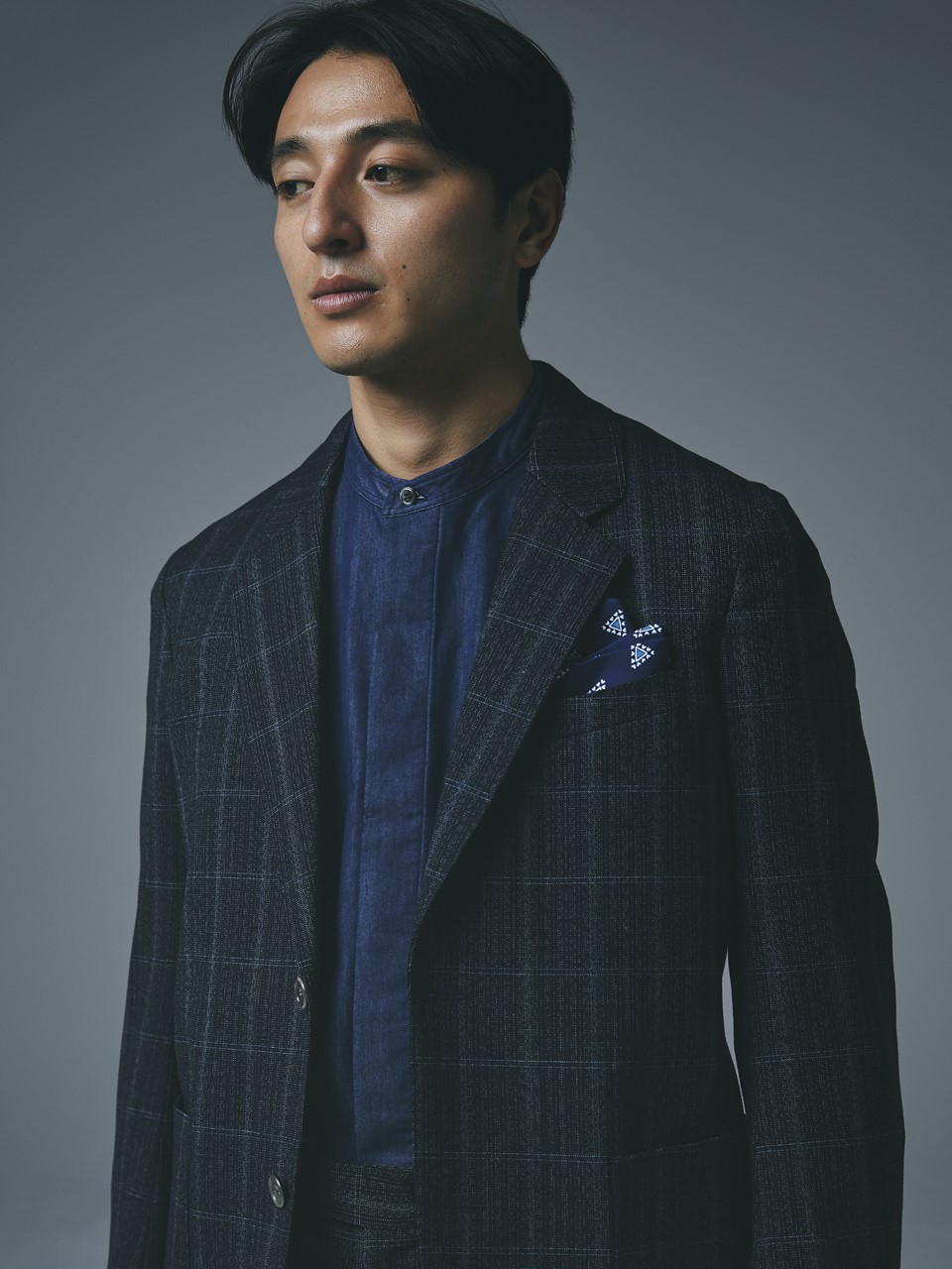 日本製にこだわるデザイナーとして知られる尾崎雄飛さんが手掛けるサンカッケーは、本誌でも大人気を博すブランドだ。そんな達人の日本贔屓を色濃く感じさせる名品が、尾州ウールを採用したセットアップスーツ。このワンセットには、尾崎さんの熱い思いが随所に込められている。