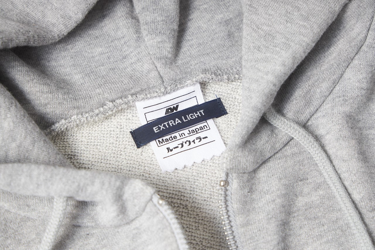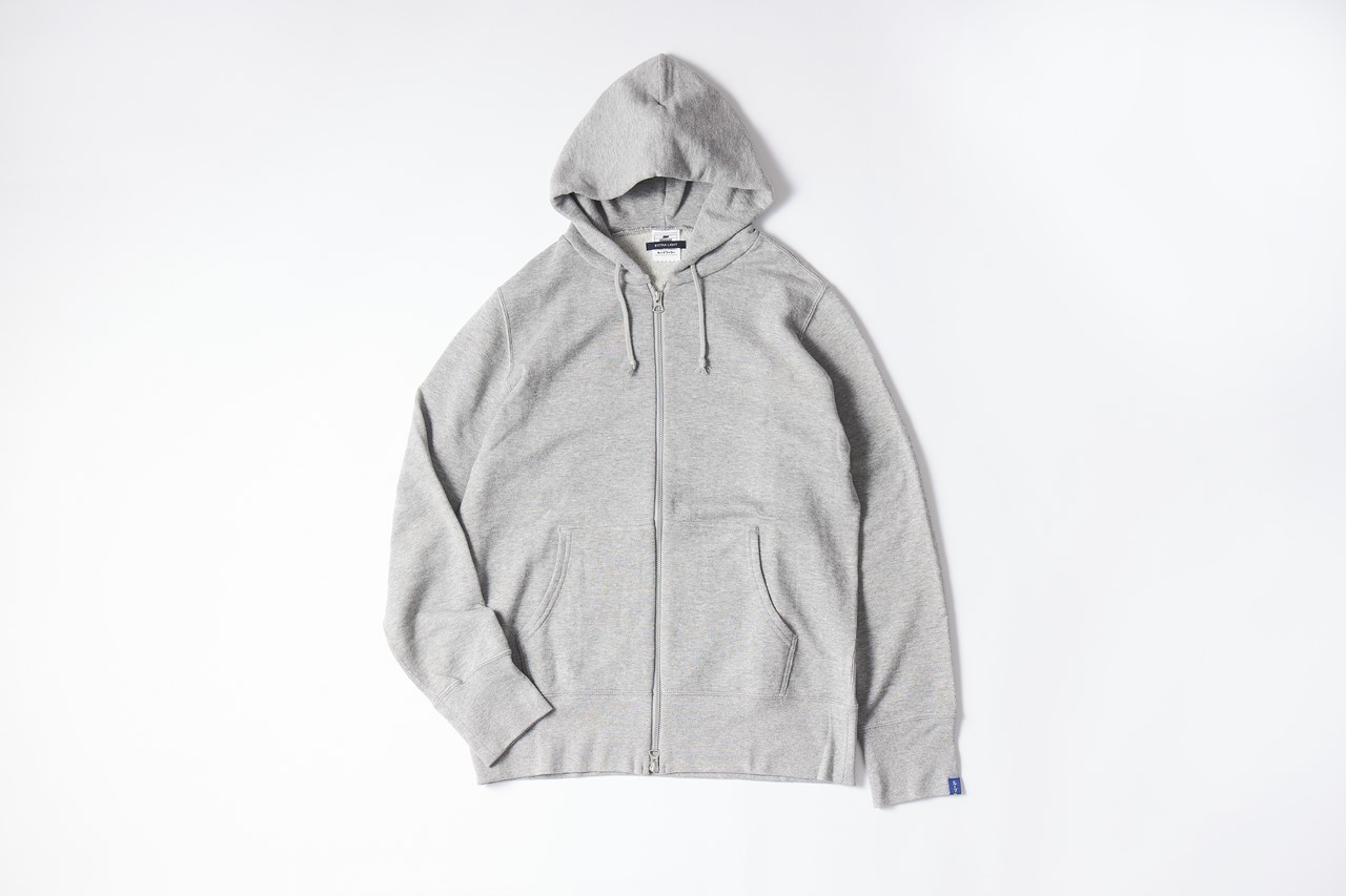 「LWエキストラライト」という吊り編み素材を用いたジップパーカ。「夏でも着られるスウェットを」と開発された同ブランドで最も薄く軽い裏毛で、着心地は最高。和歌山県に現存する吊り編み機の中でこれを編めるのは3台だけ。かつ1年に1回しか編まれない。