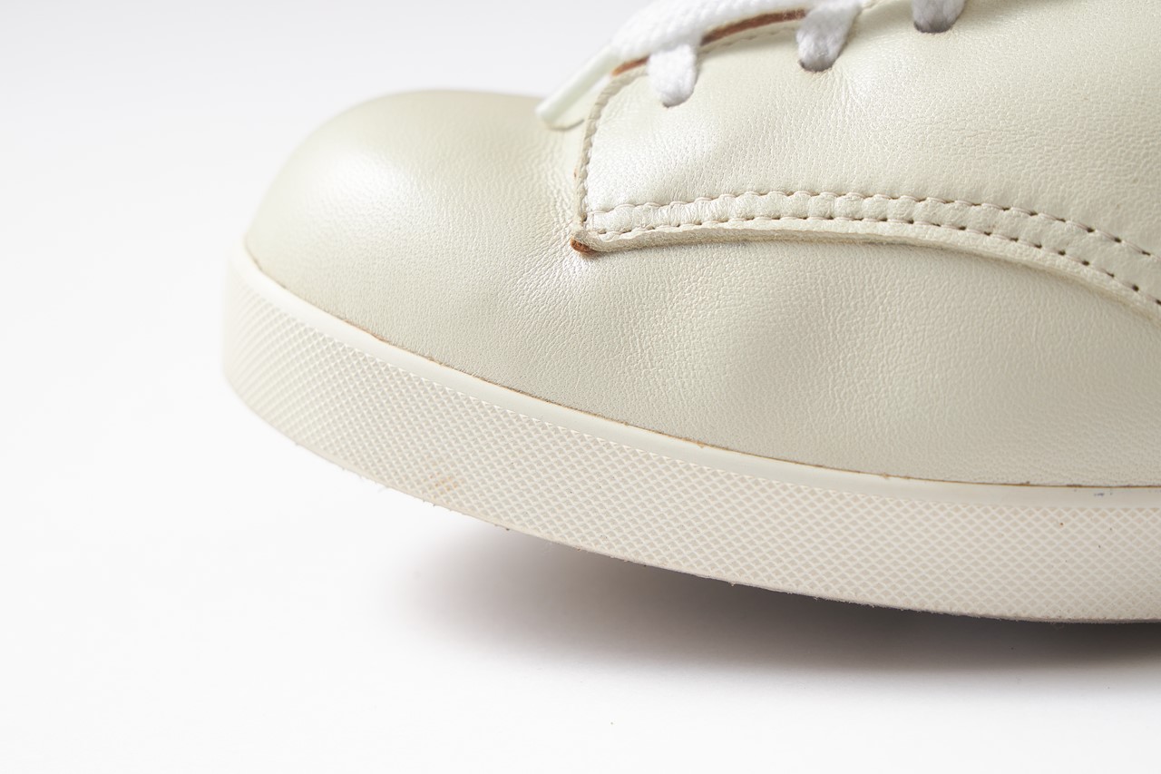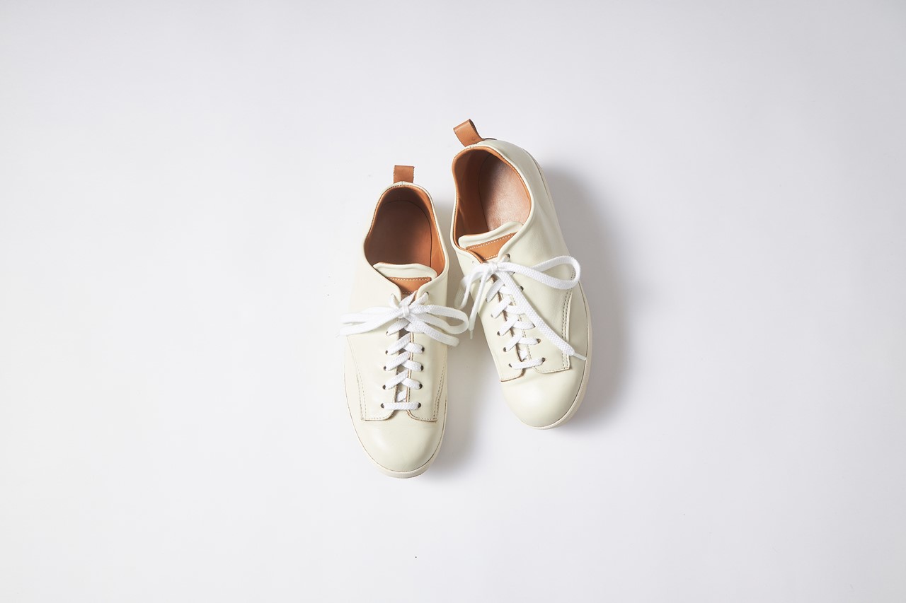 埼玉県蕨市にある靴職人五宝賢太郎が主宰するグレンストックでオーダーしたヴァルカナイズ製法のコートシューズ。ヴァルカナイズ製法は巨大な釜で熱と圧力をかけてソールを接着させるものだが、彼は自分の工房内でこの製法を用 いたスニーカーを作ってしまう。