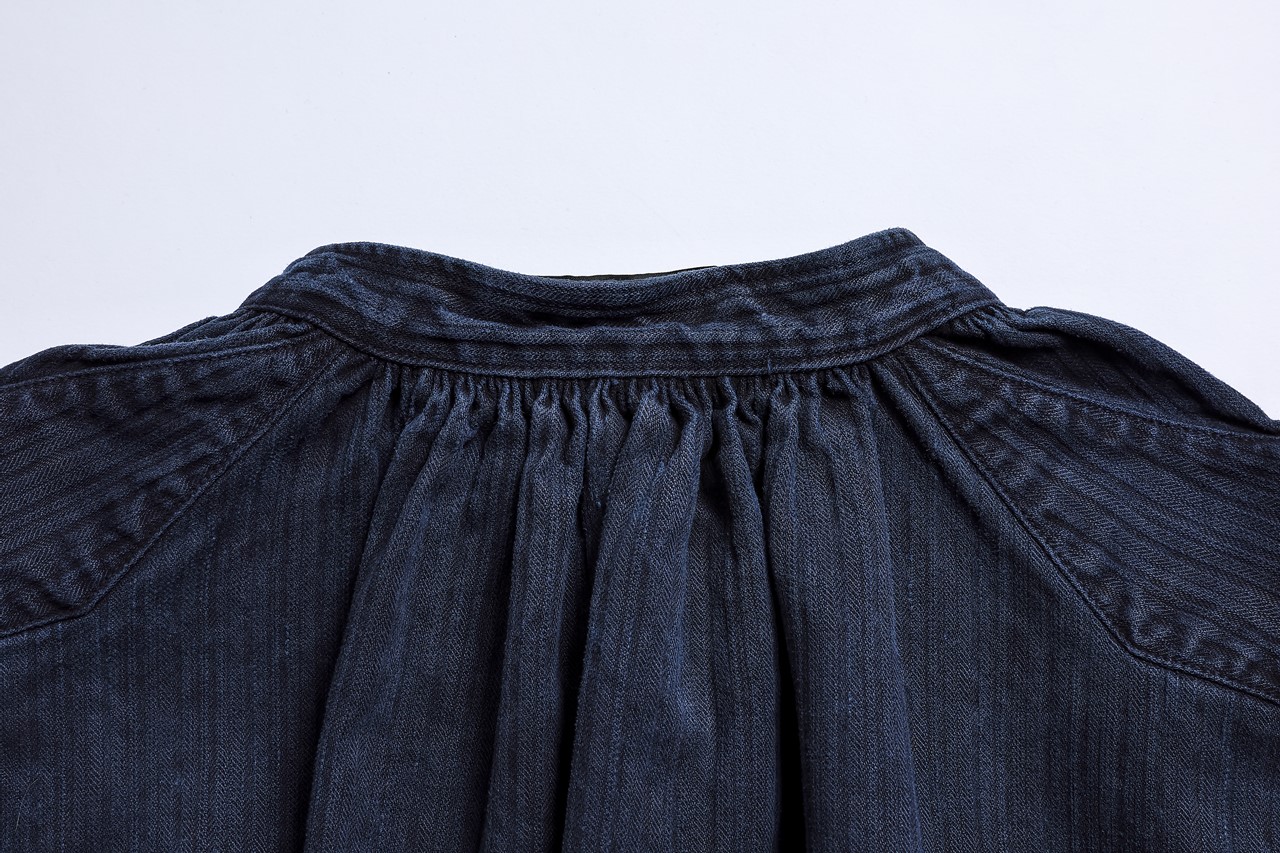オーベルジュの服作りを象徴する一着。19世紀の民族服をモチーフにメティス生地で仕上げられている。「特殊なミシンによって縫われていた首元や袖口のフレンチギャザー。これを現代のミシンで再現できる方が国内に一人だけおり、その方にすべて託しています」