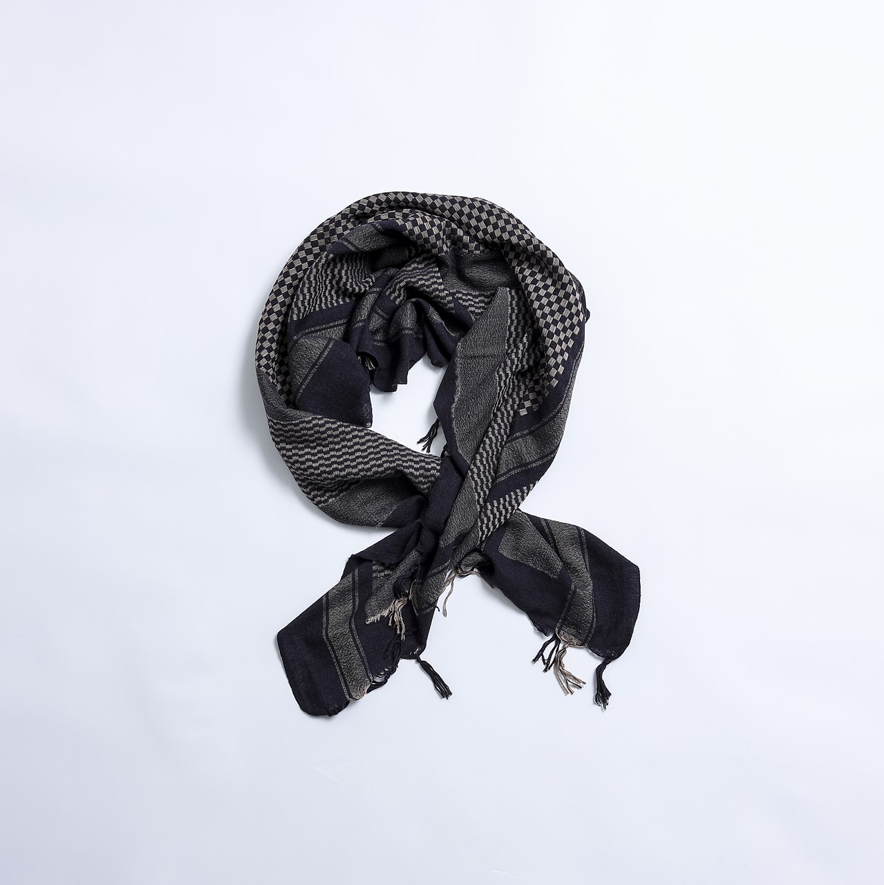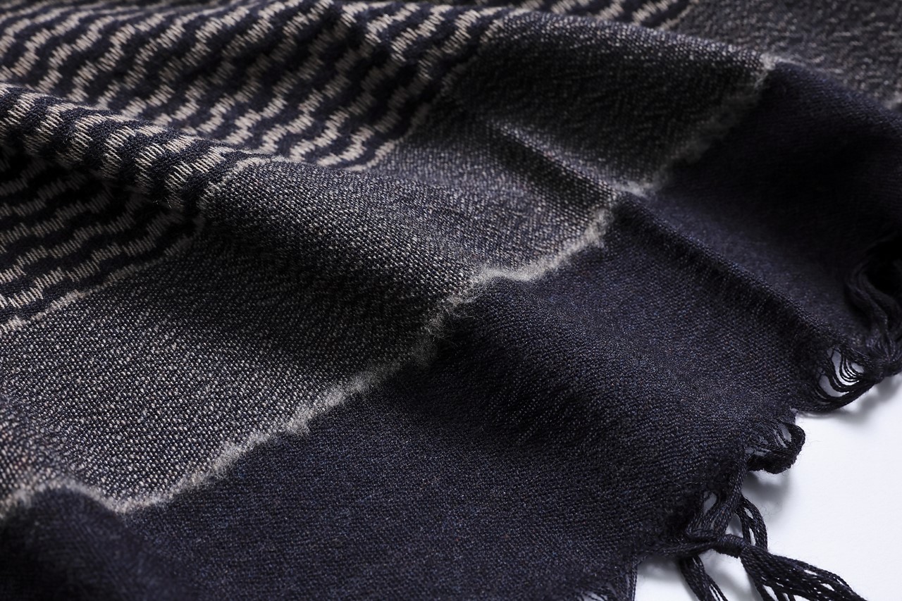 カシミヤよりも繊維が細い羊毛をドビー織機で織り上げることで薄くなめらかに仕上げられたアフガンストール。「羊毛にはキューティクルがあり熱をかけることで縮絨します。その性質を使うことで縫製せずに繊維同士を結びつけ、より薄く仕上げられました」