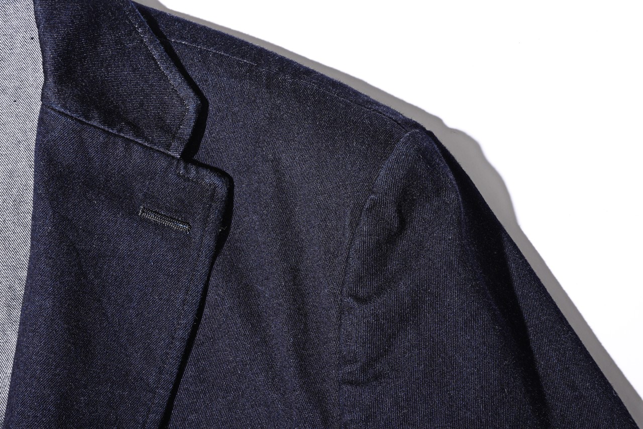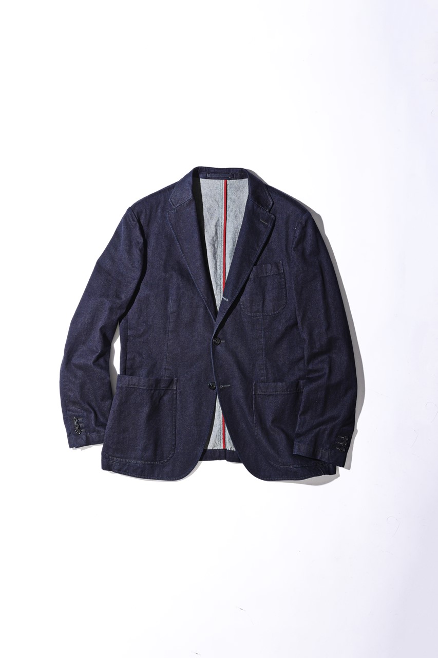 オリジナル生地のウエポンデニムで仕上げた定番アイテム。目が詰まっているため色落ちしにくく、風合いだけが増していく。「この生地でジャケットを仕立てられるのは、国産の老舗の工場だけ。日本人の体型に合わせているので、 なで肩でも美しく着用できます」
