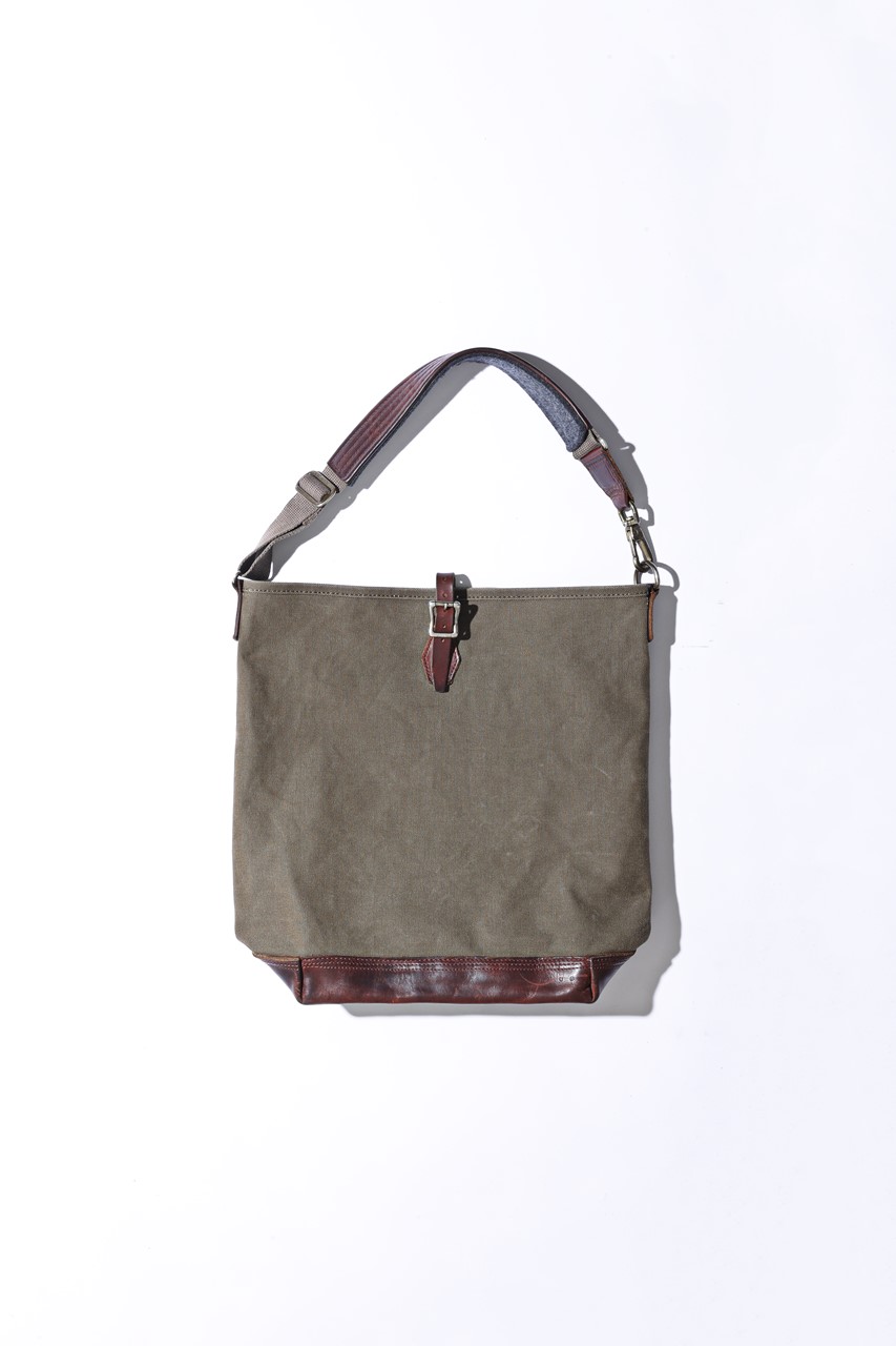 日本の鉄道広告作業員が使っていたバッグをモチーフにしたワンストラップ仕様。ベジタブルタンニンのキャンバス生地は、独自の風合いが楽しめる。「小物を細かく収納できるから、いろいろ入れても偏りにくい。なによりも、この染色は国産でしかできないはず」