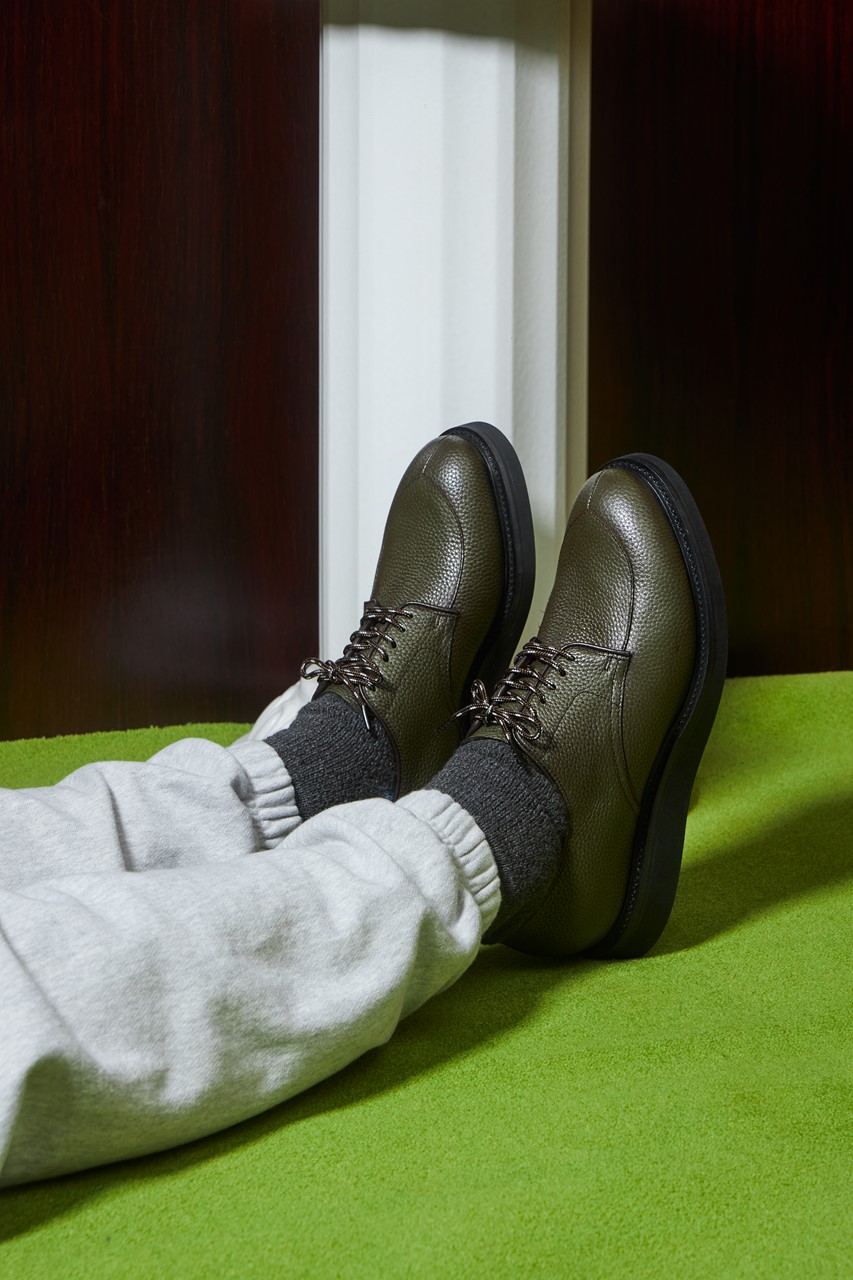 米国の古靴を愛するスーパー8シューズは、そのアルゴンキンをオリジナルで展開している。特筆すべきは、アッパーのシボ革である。米国では60年代になると濃い茶や緑の靴が数多くリリースされるようになった。今作の深い緑は、当時のフローシャイムのフレンドリー(低価格)ラインであるワースモアのロングウイングチップに見られたアイビーオリーブというカラー名を拝借。