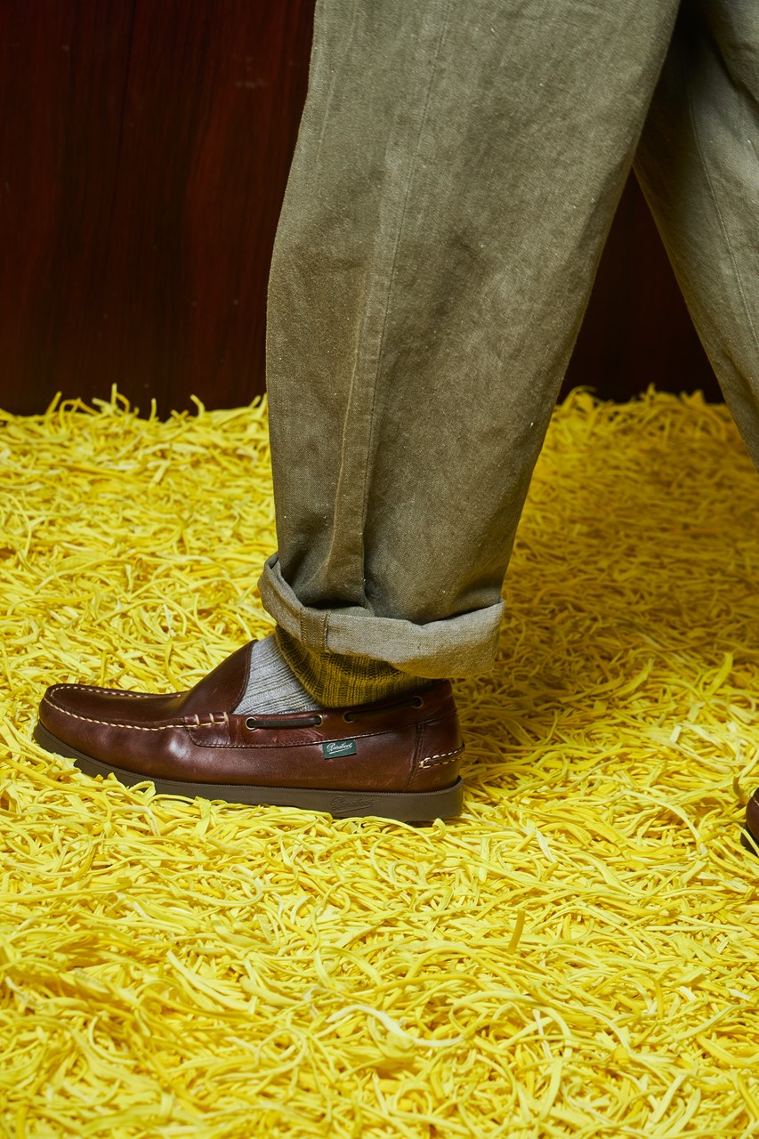 その代わりにローファーでお馴染みのビーフロールを配置。しかしながら、サドル(ローファーの甲部分に被せられる革)は見当たらない。すなわち、ローファーとデッキシューズの足し引きバランスに長けた絶妙なデザイン。そんな今作[コルス]は、10年ほど前にインターナショナルギャラリー ビームスがパラブーツに型別注したものを今季、待望の復刻。