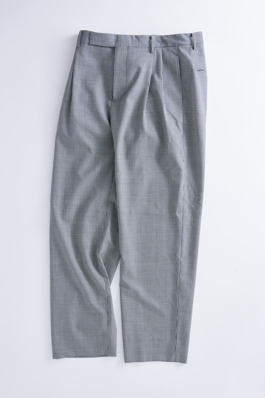 ドレスパンツを得意とする工場で製作していることもあって、マーベルトやアウトプリーツなど、作り自体はしっかりドレッシーなコロンのパンツ。ですが、シルエットをはじめとする細かい部分で、カジュアルマインドを忘れないあたりが今の時代感にも僕の気分にもマッチしています。ということで、昨年購入した無地グレーのウールスラックスに引き続き、今回は夏に向けてトロピカルウールのギンガムチェック柄を購入。