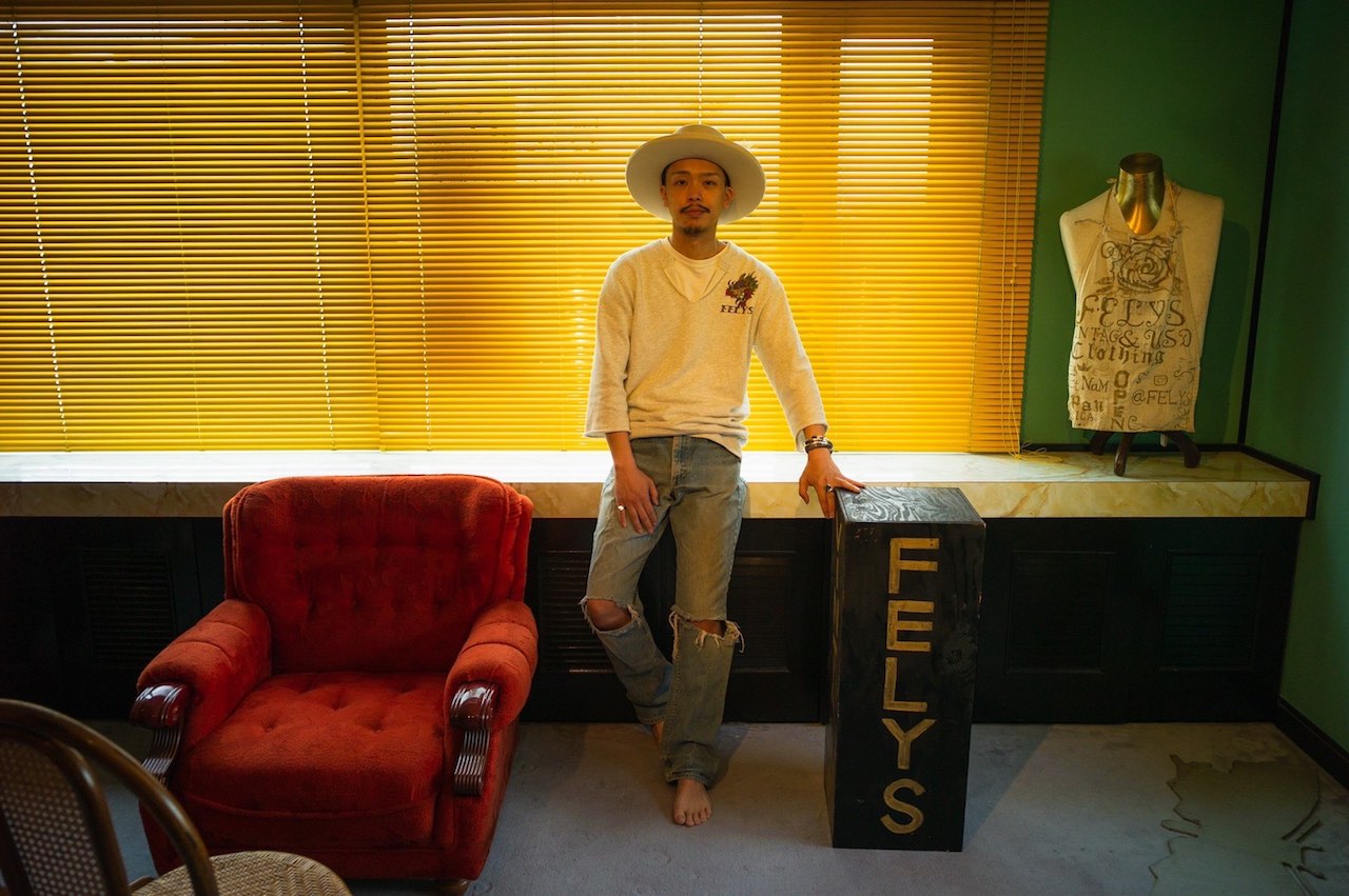 FELYSという店名の由来は、映画「フェリスはある朝突然に」からとり、主人公のように、自由で思い立ったらなんでもすぐやろう、仲間も巻き込んで。そんな想いで名付けた名前だ。ヴィンテージショップだが、オリジナルもやるし、リメイク物も幅広く展開。ヴィンテージは独自のセレクトで、アメリカの70年代前後の面がいいアイテムを中心に揃えている。