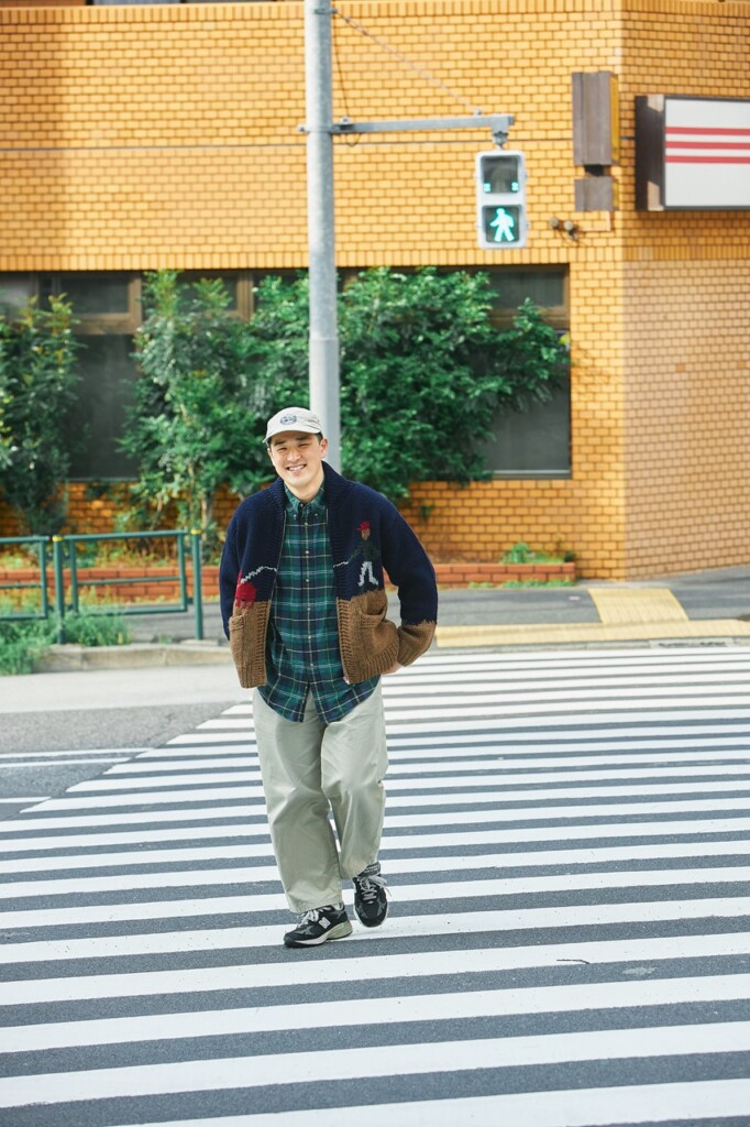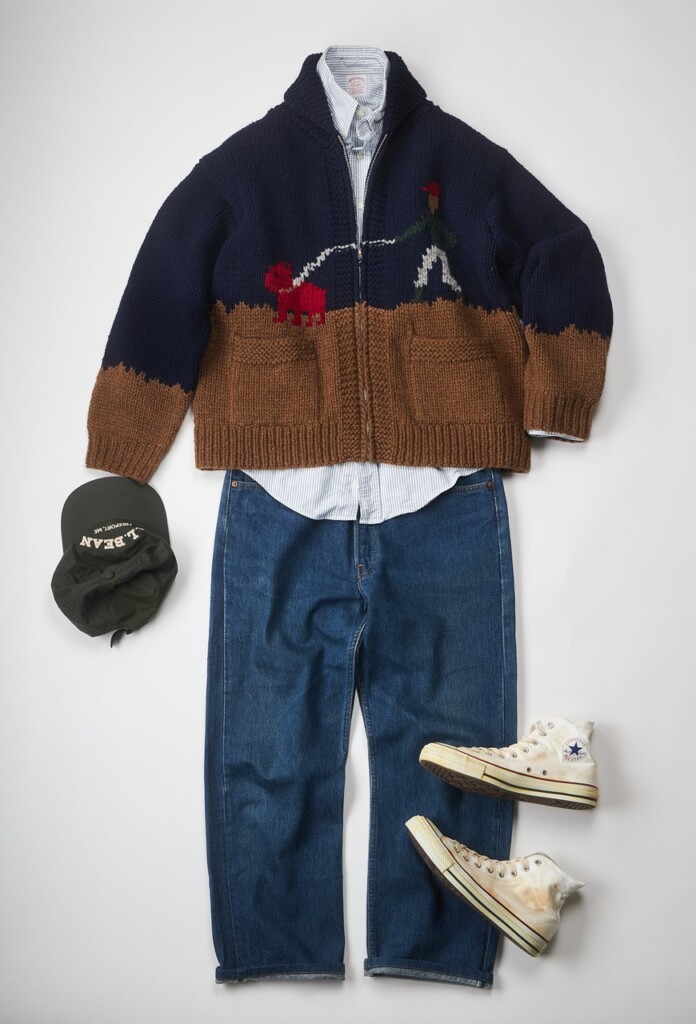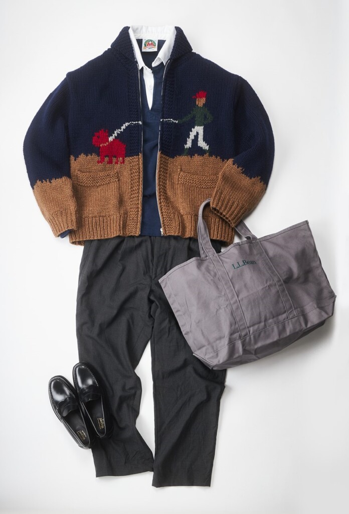 編集部ナマタメはお得意のアウトドアトラッドスタイルにカウチンを加えた。配色のおかげでカジュアルさの中にも品の良さを滲ませる。