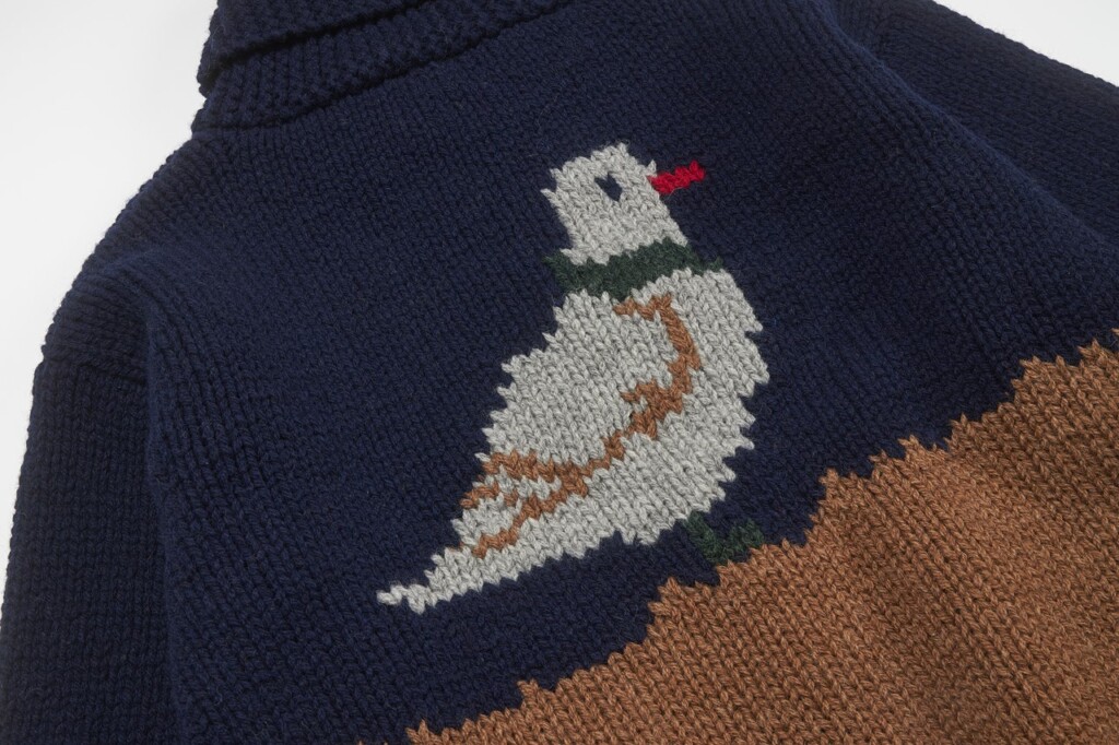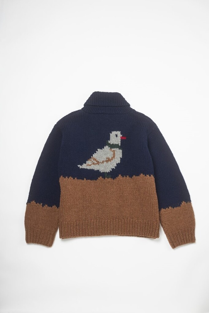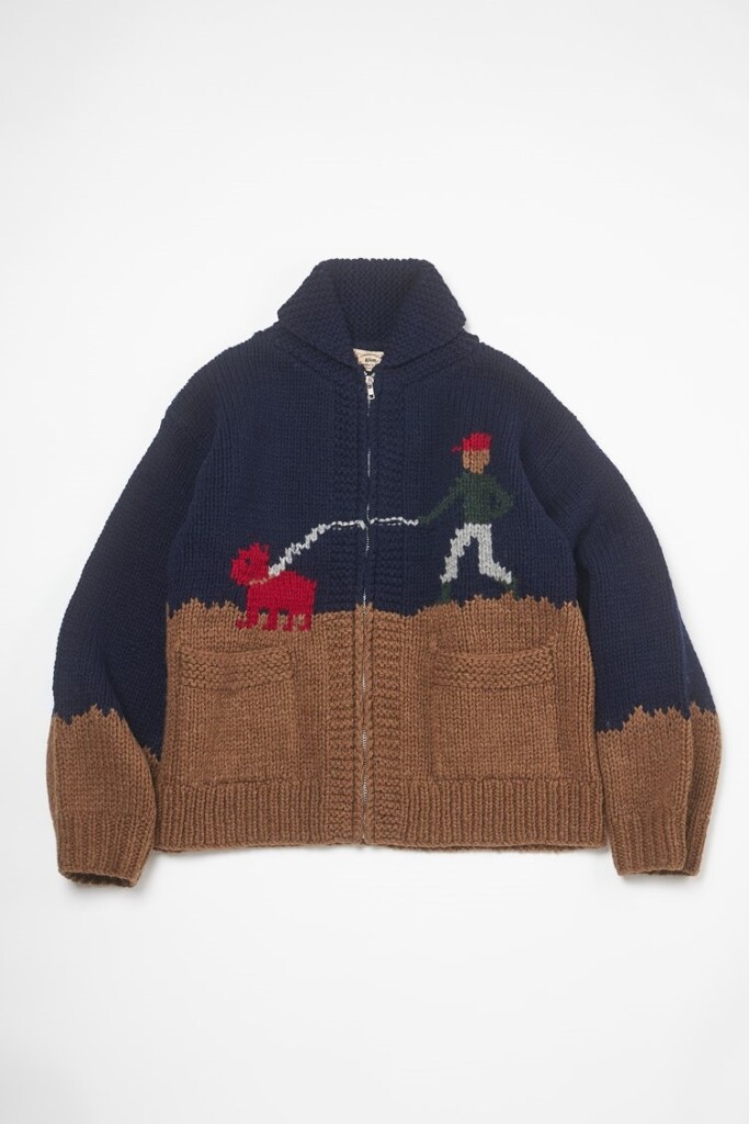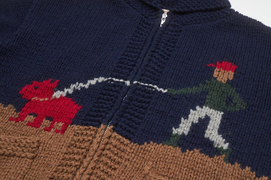 カウチンセーターの名前はカナダのバンクーバー島に位置するカウチン湖、さらにはその湖畔に定住した先住民族「カウチン族」の伝統的な衣類に由来する。彼らの信仰や狩猟の対象となったモチーフが柄として編み込まれ、油脂を多く含んだ太い羊毛を使用することで防寒性や撥水性を高めたと言われている。ヴィンテージを見回すとサンダーバードやトーテムポール、鳥や魚、熊など、柄は様々。ジップ式やボタン留めとバリエーションは多様だが、近年見かけることの多い機械編みの“それっぽい”セーターをカウチンと呼ぶことには疑問を覚えずにいられない。
