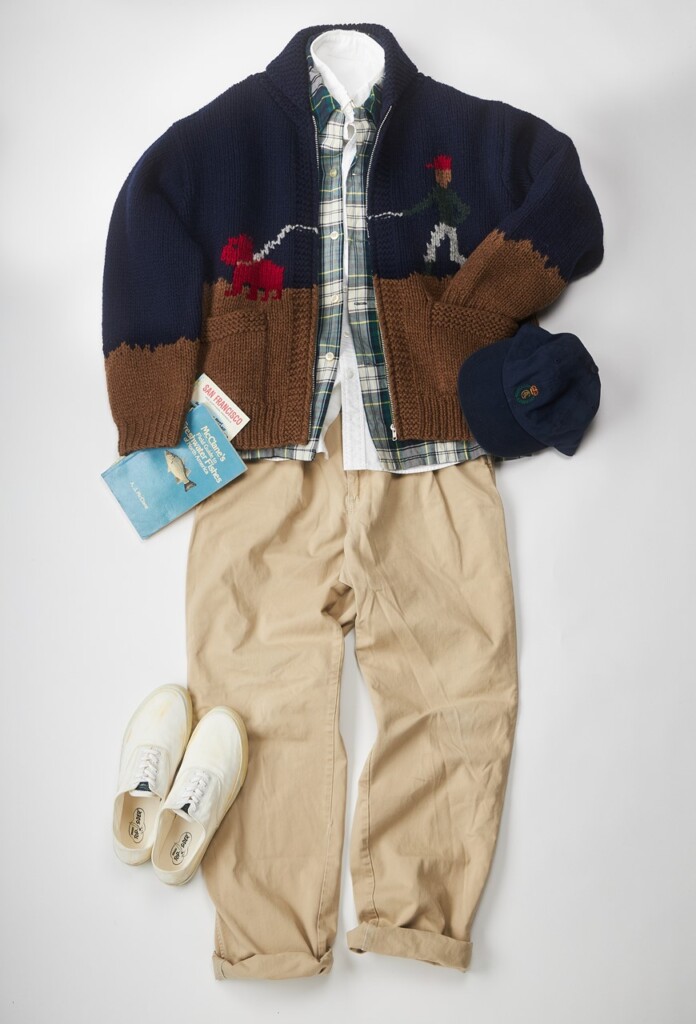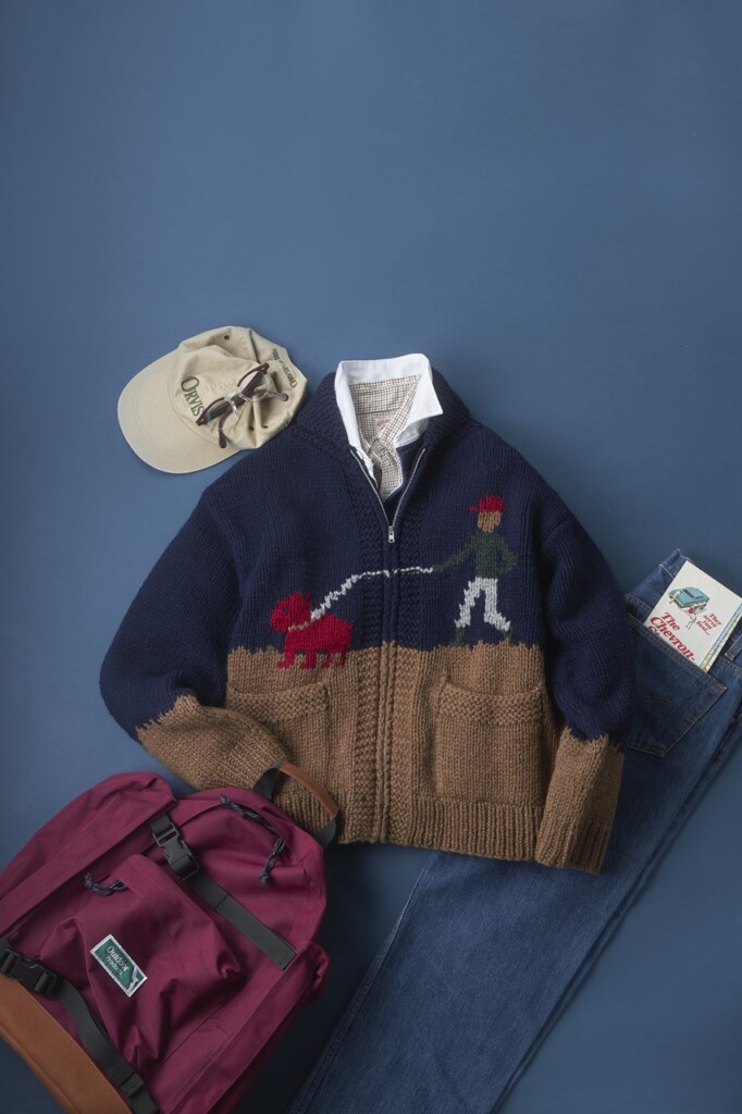 ヴィンテージのカウチンはベージュが多くを占めるが本作は品のいいネイビー&ブラウン。デニムと組み合わせたスポーティなトラッドなスタイルのほか、パンツを選ばない汎用性が嬉しい。ジャケット代わり、アウターとして使い倒したい。