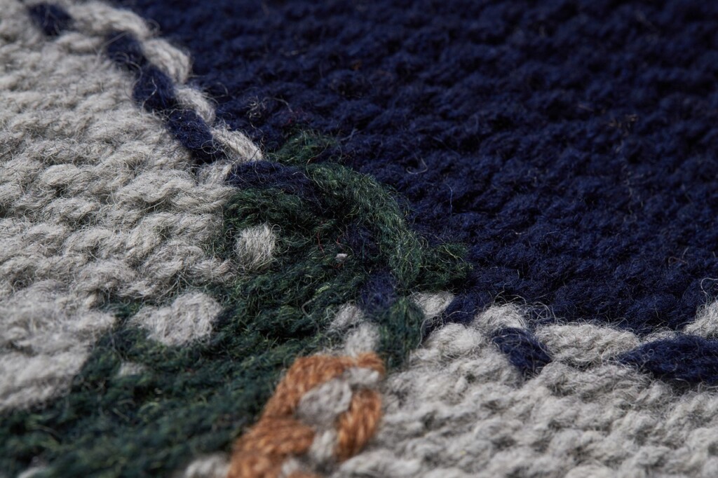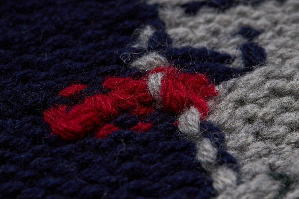 糸の色の切り替え部分の結び目こそ「手編み」の証左。