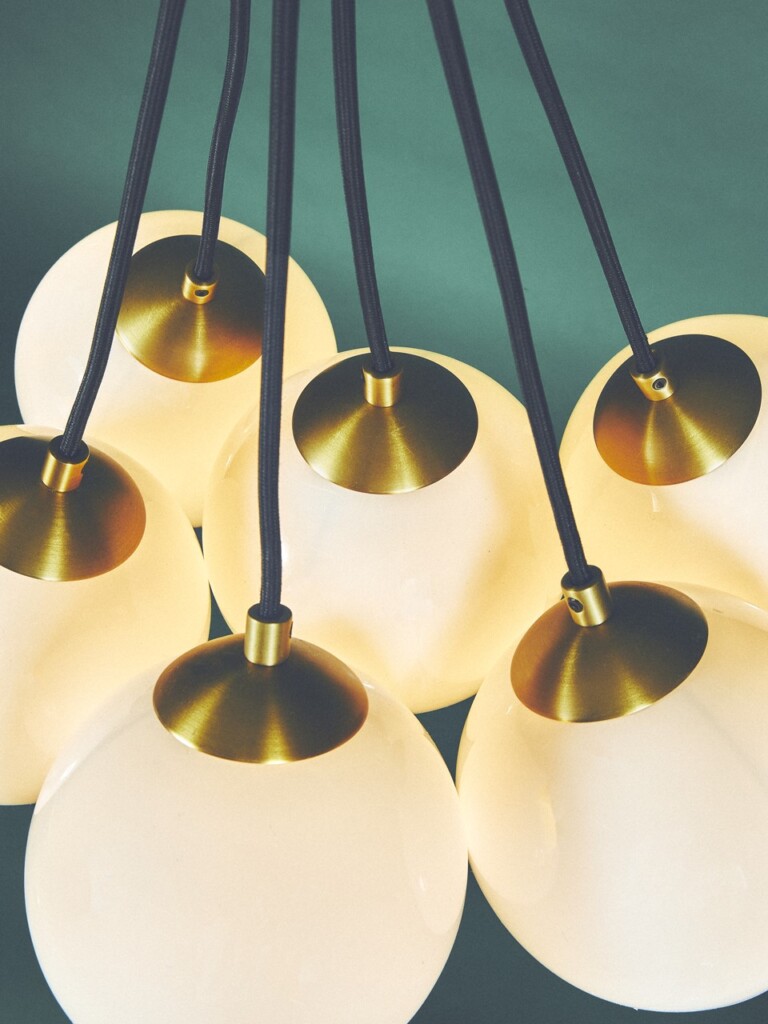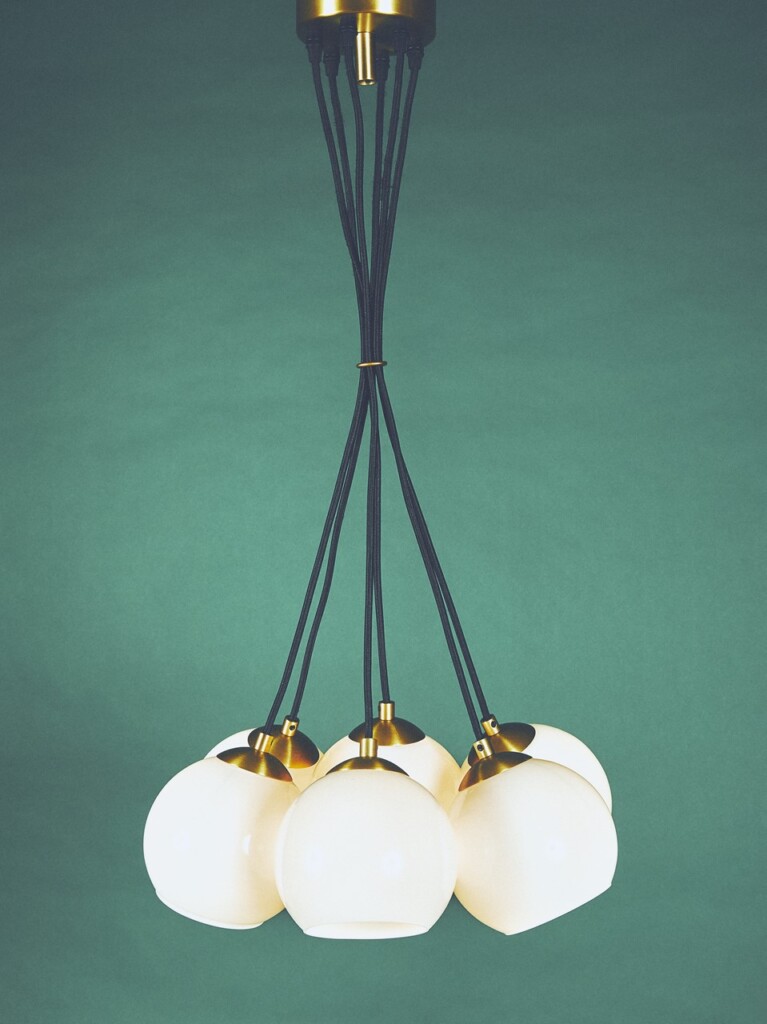 小ぶりのガラスシェード6 つからなる[ サンマルコ6]。1 灯ごとにコードの長さを調整できるので、天井の高さや、家具に合わせて設置が可能となっている。乳白色のガラスを通した光は柔らかく、空間を優しい印象をもたらす。部屋の雰囲気をガラリと変える主役級アイテム。