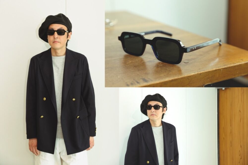 最後に、平井さんのトレードマークのベレー帽にブレザーを合わせたシンプルなスタイルに合う一本を選んでもらった。トレンドの兆しが濃厚な細長いスクエアのサングラスをチョイス。フロントはややフラット気味でとてもクールな印象を受ける。ほとんど黒に近い濃紺のフレームはブレザーとの色合わせも良い。こちらはOSCAR MAGNUSON(オスカー マグヌソン)というスウェーデン発のエシカルでクリーンなアイウェアブランドだ。ヨーロッパでは非常に力のあるブランドだが日本ではまだ取り扱いは極少。にも関わらずNeuではかなり多くのモデルがみられた。