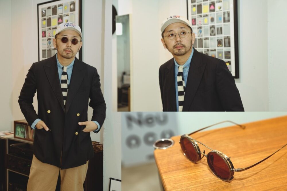 次に筆者も。王道のアメトラスタイルには、クラシックなラウンド型のメガネ。こちらは、 先ほどご紹介した KameManNenというブランドで、チタン製で非常に軽く、ストレスなくかけやすい。一般的にはチタンを用いる場合は、細いデザインが多い。しかし、こちらのメガネは、4mm の厚さがデザインポイントとなり、軽さ、丈夫さを兼ね備えた玄人好みのモデルとなる。 また普段はクラシカルなラウンドスタイルのメガネとして着用できるが、別売のクリップオンをセットすることで男らしいダブルブリッジのサングラスに早変わり。2WAY で楽しめるのは、嬉しいポイント。