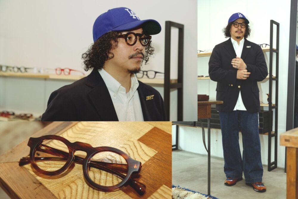 ストリートが好きな小島さんは、ルーズ・フィットなブレザースタイルが好み。 選んだのは「Jacqes Durand (ジャックデュラン)」のラウンド型。坂本龍一氏が愛用していたことでも有名なフランス発のブランドだ。ストリート寄りの着こなしに合わせてメガネも豪快なデザインを選ぶのではなく、個性はあれど、あえてややクラシックな印象のあるメガネで引き締めたのがポイントだ。ササ柄の生地はちょっとした表情もあるが、意外と癖がなくかけやすい。 このブラウン系のカラーでシューズの色も拾ったことで、一見ジャンルの違う服装とメガネに統一感を生み出せる。