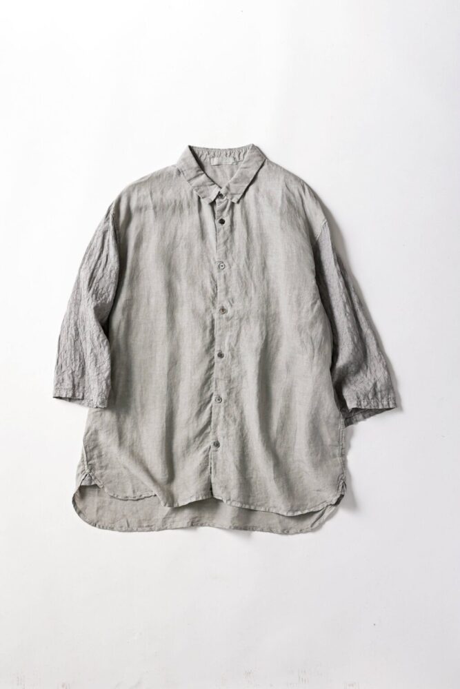 一見、シンプルなグレーシャツ。ただ、細部を注視すればその評価は一変する。まずはカフスレスの七部袖。そこには繊細な幾何学模様のインド刺繍が施され、ミニマルなボディと絶妙なコントラストを描く。さらにシャツ全体を顔料染めでオーバーダイすることで、ナチュラルな麻の風合いにムラ感をプラス。天然素材にこだわるブランドらしい、優しくユニークな技に心奪われる。2万4200円(コンフェクト表参道TEL03-6438-0717)