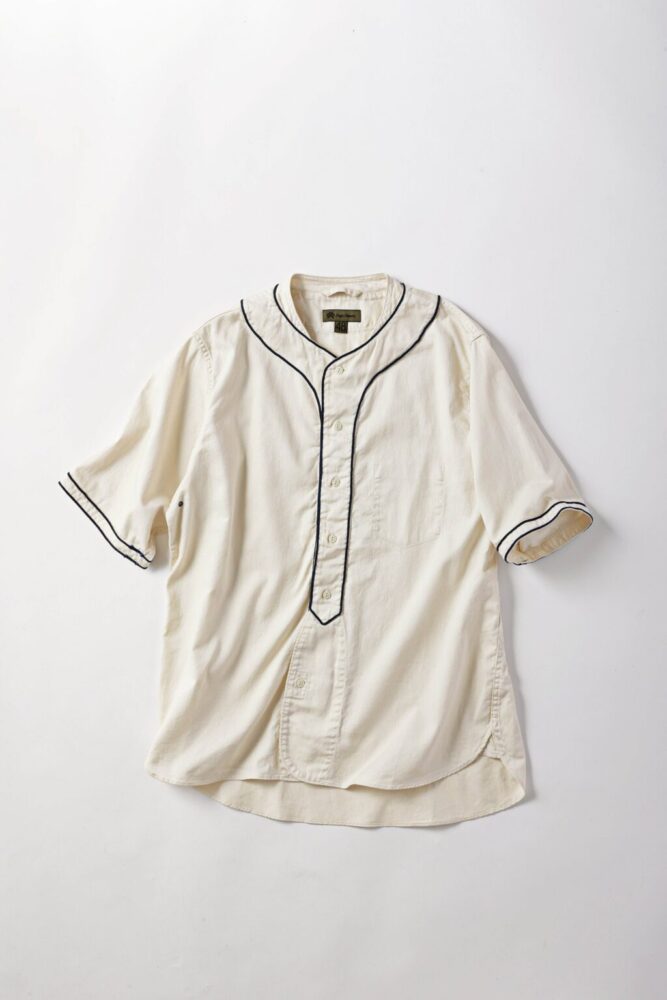 ヴィンテージを現代に蘇らせる。その手腕と情熱において、当ブランドの右に出るものはいまい。コットンツイルを使ったベースボールシャツも、まさに至極だ。いい意味でくたびれた柔らかなボディで、オリジナルモチーフが生まれた50年代の雰囲気を再現。パイピングと脇下の通気孔はネイビーで揃え、クラシカルかつ爽やかな空気を作り出した。汗止めのためのネック内部のスタンドカラーといったディテールも、確かな違いを生む。2万9700円(アウターリミッツTEL03-5413-6957)