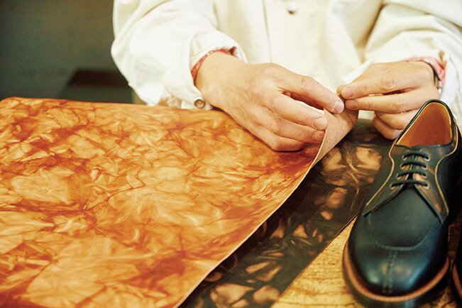 吉見鉄平さん そうですね。あること自体は薄っすら聞いていましたけど、まさか自分が扱うことになるとは思っていませんでした。基本的には革小物やバッグなどに使われている革のひとつで、我々靴職人にはなかなか縁遠いものだと考えていましたし。