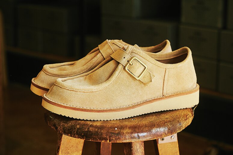 中)ドレスラインとは異なるオリジナルラストを採用し、レンドのカジュアルドレスラインを代表するモデルとなった外羽根式のUチップ。アッパーのエプロン部とキルトにムラ感のある泥染めレザーでポップなアクセントを加えている。8万1840円(オーダー価格)