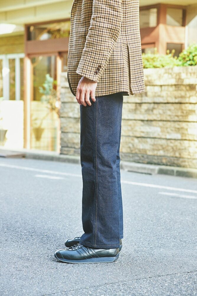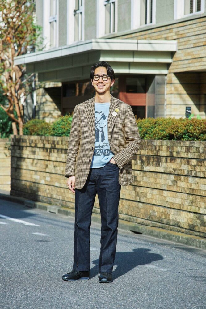 「アウターはガンクラブチェック柄のウールリネンジャケット。この柄は狩猟などの野外活動で着られてきたものなので、アディダスがオフロードを走破するクロスカントリー用に開発したモデルとの相性は悪くないと思っています。ウイングチップやサイドゴアブーツのような革靴に比べたら、かなりハズした合わせにはなりますが、実は文脈を揃えているのです」