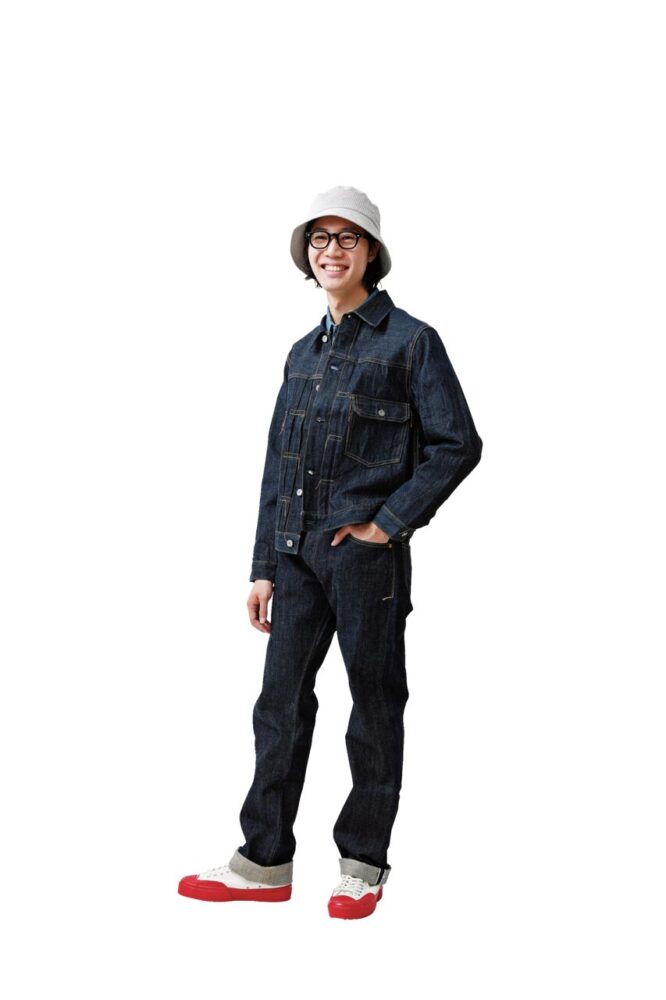 ワークとミリタリーの相性がいいことは、もはや説明不要だろう。上下デニムの武骨な着こなしだが、大胆な赤が茶目っ気たっぷりのアクセントに。いや、もはやスニーカーが主役として活きるコーデと言って差し支えない。