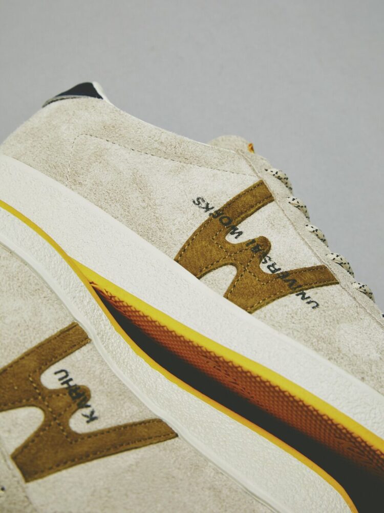 このコラボモデル、ベースとなったのはカルフの定番[トランパス]。ユニバーサルワークスは、2009年にスタートした英国のファッションブランドで、旧いワークウェアなどを、英国の伝統的なデザインと組み合わせ、現代の解釈で再構築することを得意とする。