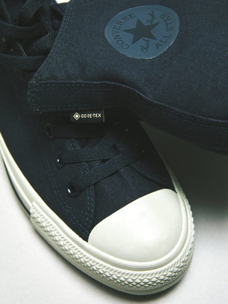 スニーカーに限らず革靴や服にいたるまで、とにかく近年のゴアテックス人気は凄まじいという噂を耳にする。ファッション性と機能性のミックスに定評のあるナナミカと、コンバースのコラボによって生まれた[ゴアテックス ハイ]ももちろん例外ではなく公式ECサイトを見てみると、すでに人気サイズから在庫切れのものが出始めている。運よく手に入れられたあなたは、これで雨の日でもハイカットのコンバースを履いて何も気にせず外出できるようになるだろう。