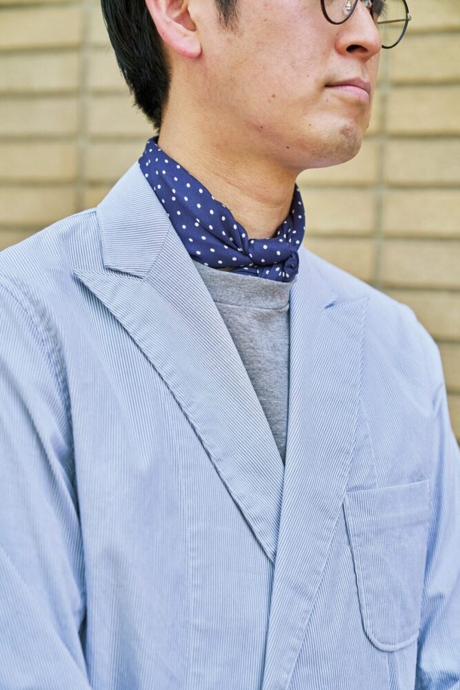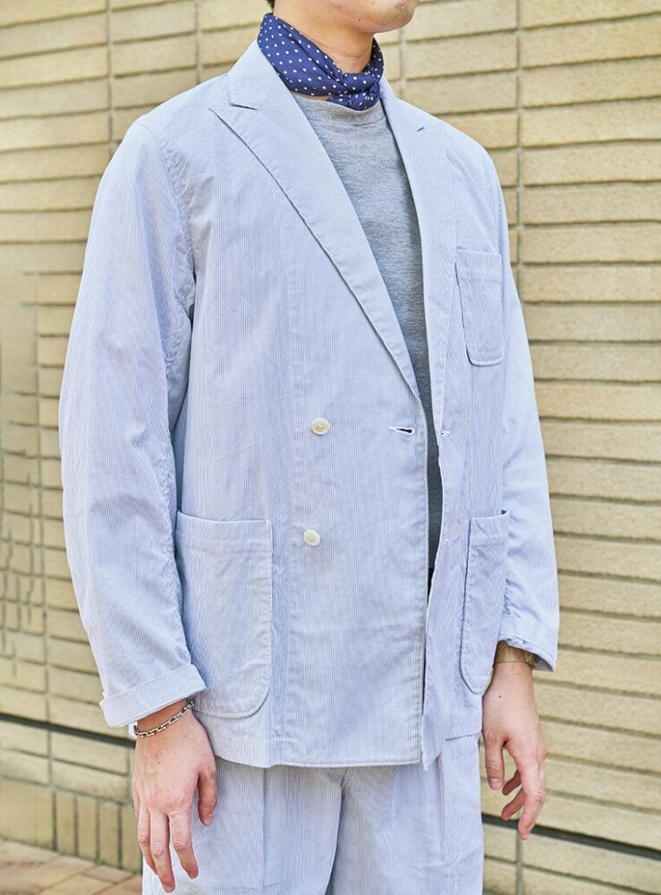 「今回は夏の代表的な生地であるコードレーンのセットアップを中心にコーディネイトしました。フロントがダブル仕様になっているジャケットはドレッシーな印象。そんなアイテムをカジュアルに着こなすためにインナーはクルーネックのTシャツを選びました。色は白ではなくグレーを選ぶことで全体が引き締まった印象になります。色選びでカジュアルになりすぎないように注意しています。