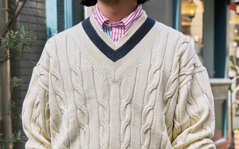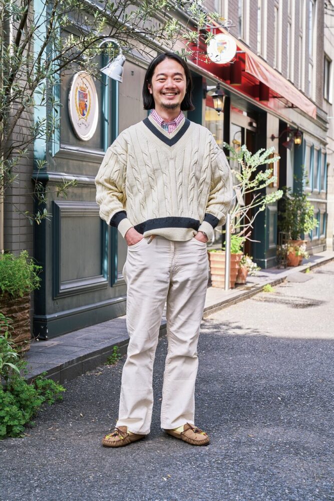「チルデンニットにボタンダウンシャツ、細畝のピケパンツにモカシンシューズと王道なトラッドアイテムを選んでいるのですが、キャンディストライプがクレイジーパターンであったり、パンツがブーツカットになっているなどディティールではずしたスタイリングにしました。