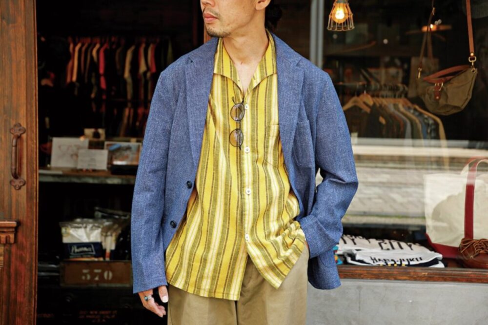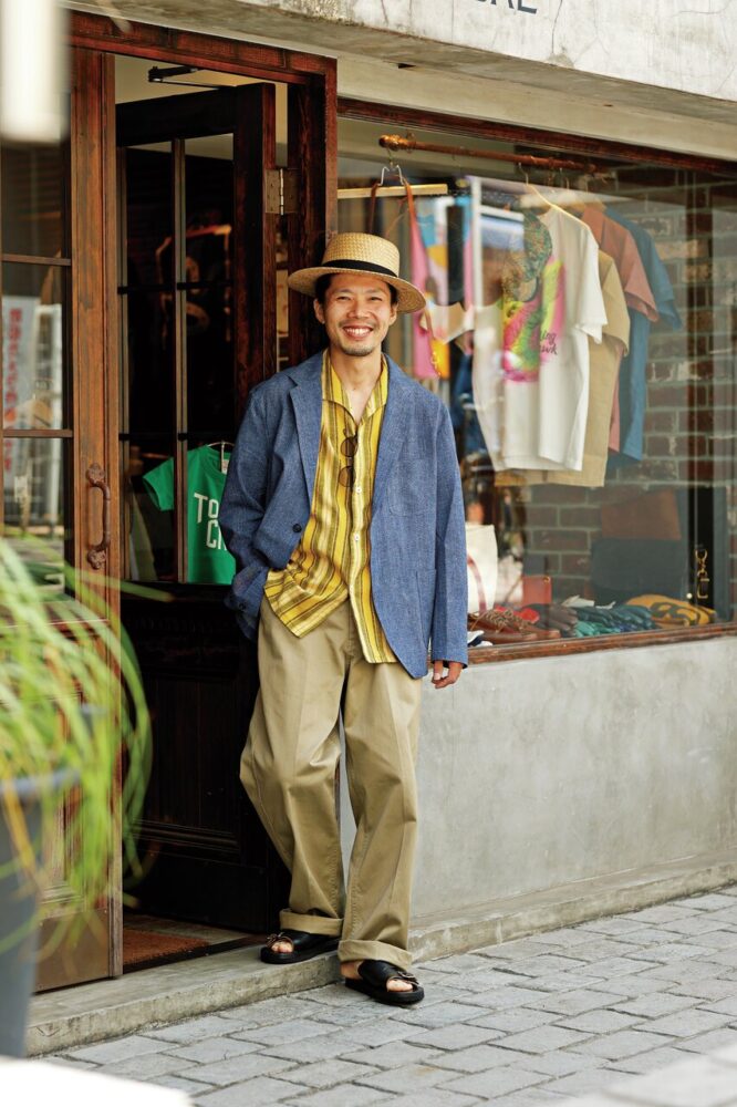 「ジャケットにストライプのシャツ、チノパンにレザーサンダルと大人が着用しやすいアイテムとしてスタンダードなものを選びました。昨年であれば、インナーには白や、無地のボタンダウンなど、シンプルなアイテムを選んでいたと思いますが、今年は着用しているような、マスタード色のストライプ柄など明るい色を差し色としてスタイリングに取り入れていきたいと思っています。