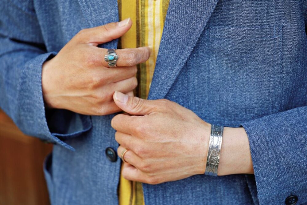 「手元にはアクセントになるようなシルバーを付けています。シンプルなスタイリングでは細部で個性を出すように心がけています」