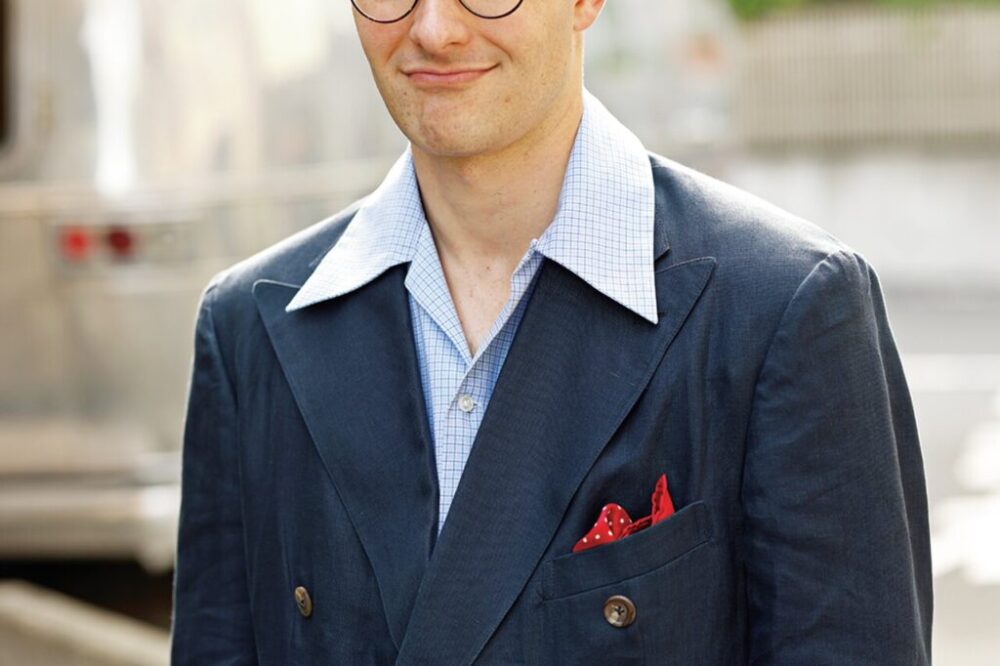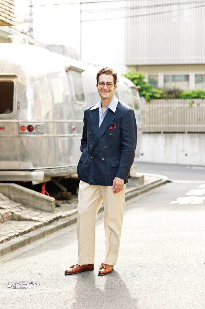 「11歳のころ、タイの正しい結び方を父親に教わってからファッションの面白さにハマりました。出身がニューヨークなのでベースは東海岸のスタイルですが、母がイタリア人なので、ヨーロッパの要素も取り入れています。ジャケットはたくさんポケットが付いていることもあって便利なので、自分のスタイルには欠かせないアイテム。友人と食事に行くときはもちろん、公園に散歩に行くだけで着ることもあるぐらいです。