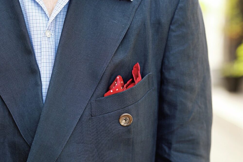 「数年前まではジャケットにチーフを挿すことがセオリーでしたが、最近はあまり気にしないようになったので、TPOに合わせて選んでいます」