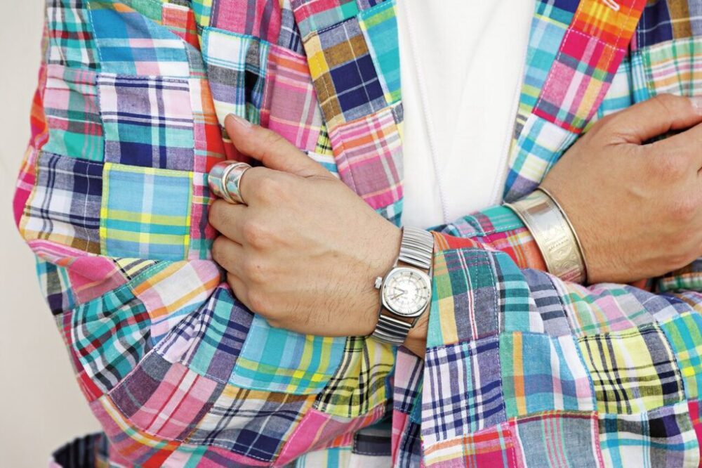 明るい派手な色で構成されている、パッチワークマドラスジャケットに合わせているのは、シルバーで揃えられた白文字盤の時計、リング、バングル。シンプルな柄の無い無地のアクセサリーであるがサイズは大きめの存在感のあるものをチョイス。