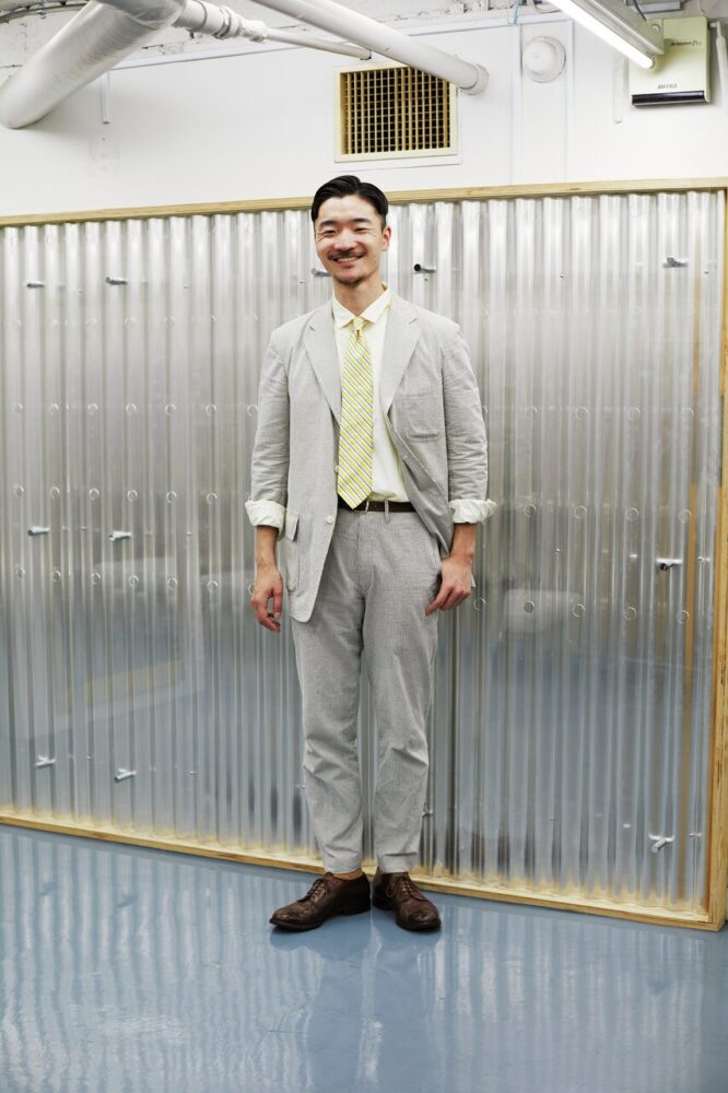 「2022年発売され本年の春夏も引き続きラインナップされているシアサッカー素材のセットアップが、個人的には夏のトラッドスタイルの定番アイテムとなっています。というのもどこをとっても塩梅がちょうどいいからです。スタイル的にはフォーマルすぎずカジュアルすぎず、色味も落ち着いており、リゾート感が強くなりすぎることもない。また素材的には、リネンよりもシアサッカーの方が日本の気候に合っていると個人的に感じるのも大きなポイントです。