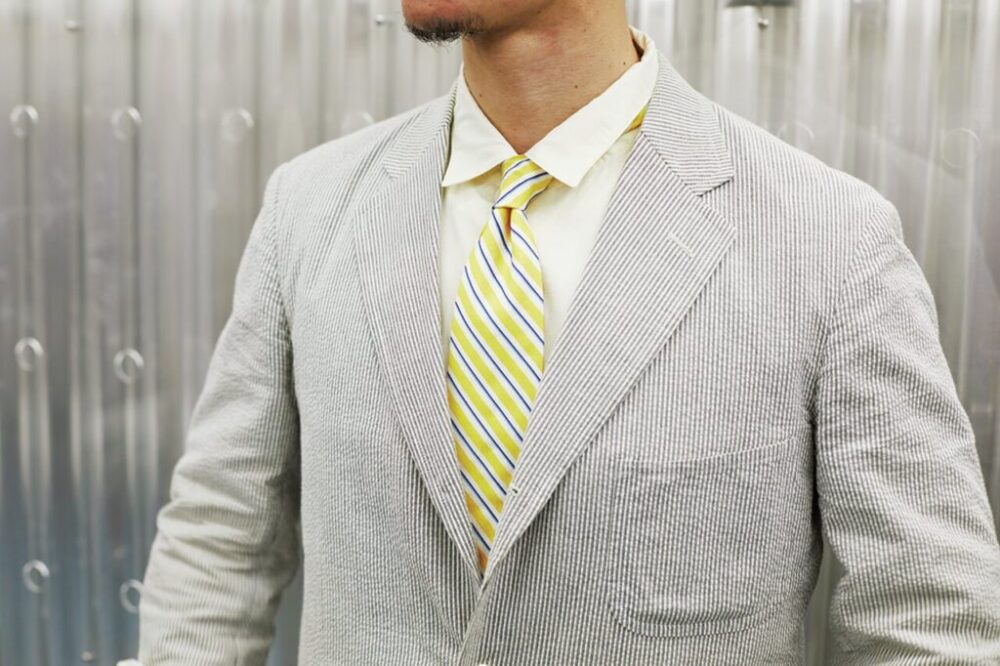 「シアサッカーが白×グレーなのですが、すこしクリーム色に近いイエローを合わせることで、夏らしいワントーンコーデに仕上げています」