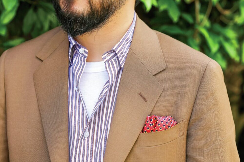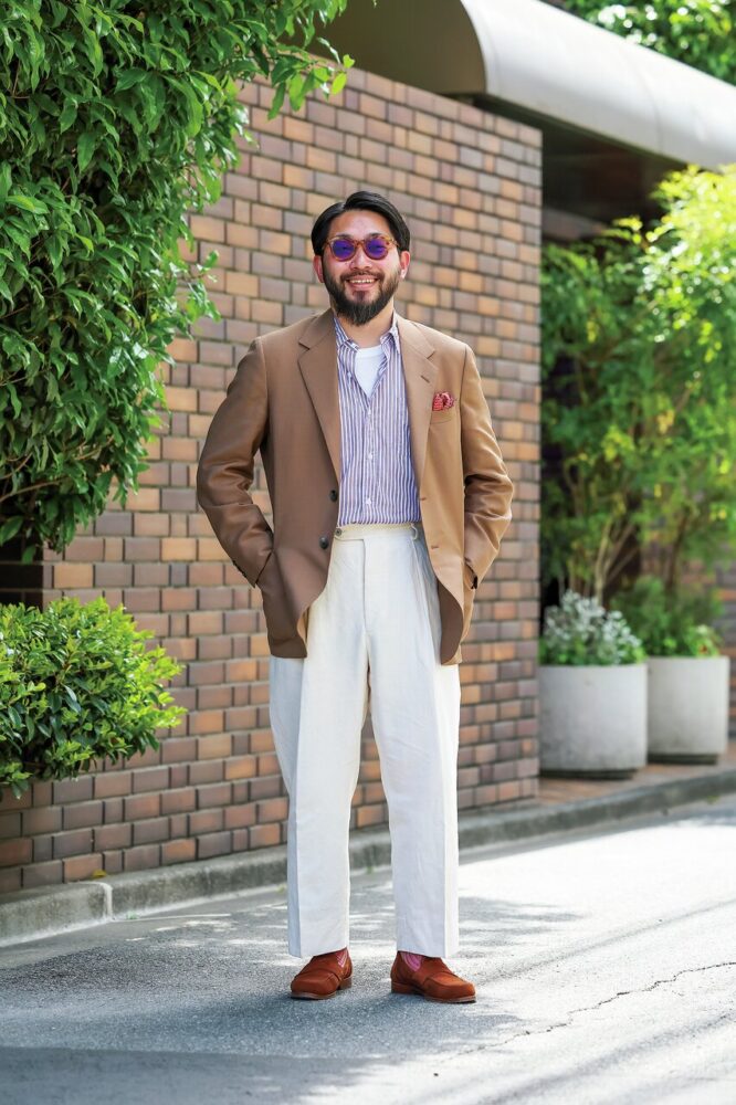 「ジャケット、シャツ、スラックス、革靴と、定番のトラッドアイテム同士を組み合わせていながら、色やちょっとしたバランスで随所にハズしを加えています。たとえばニートのリネンパンツも、もう少し股上が浅いと艶っぽい印象になってしまいますが、この股上の深さやシルエットにはどこか抜け感がある。