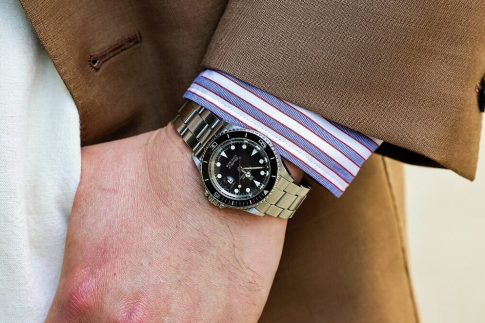 【ポイント②】メタルブレスの腕時計。